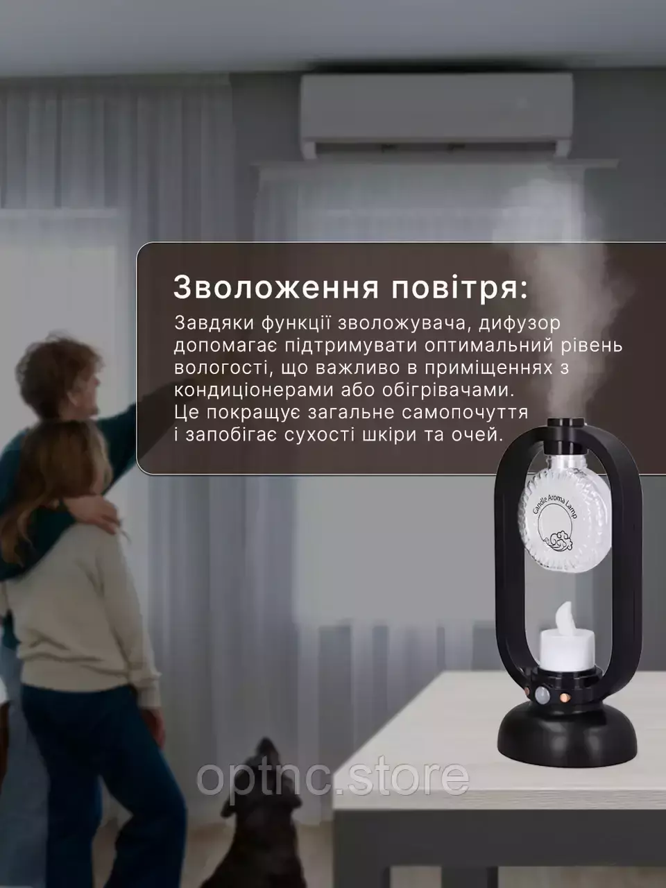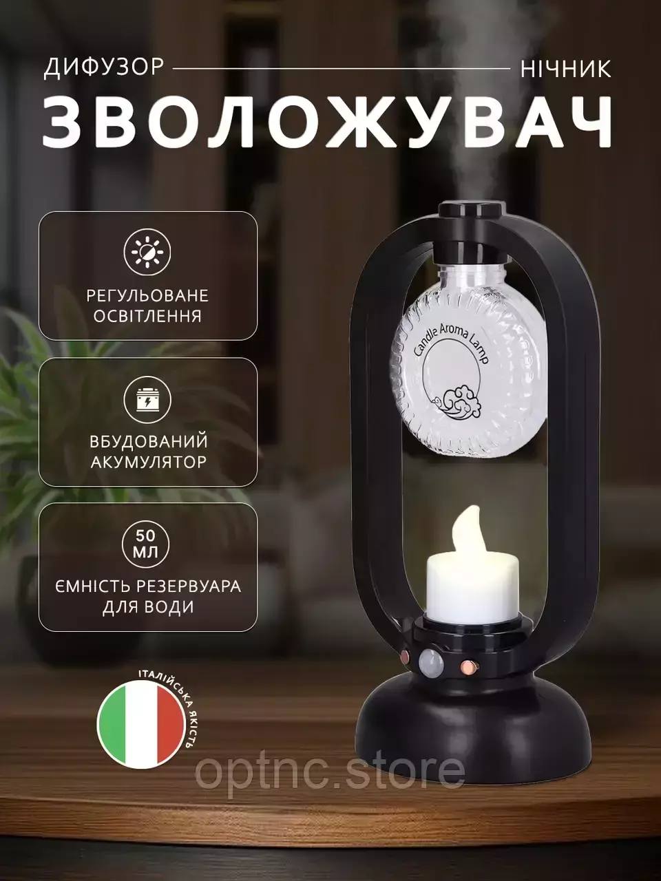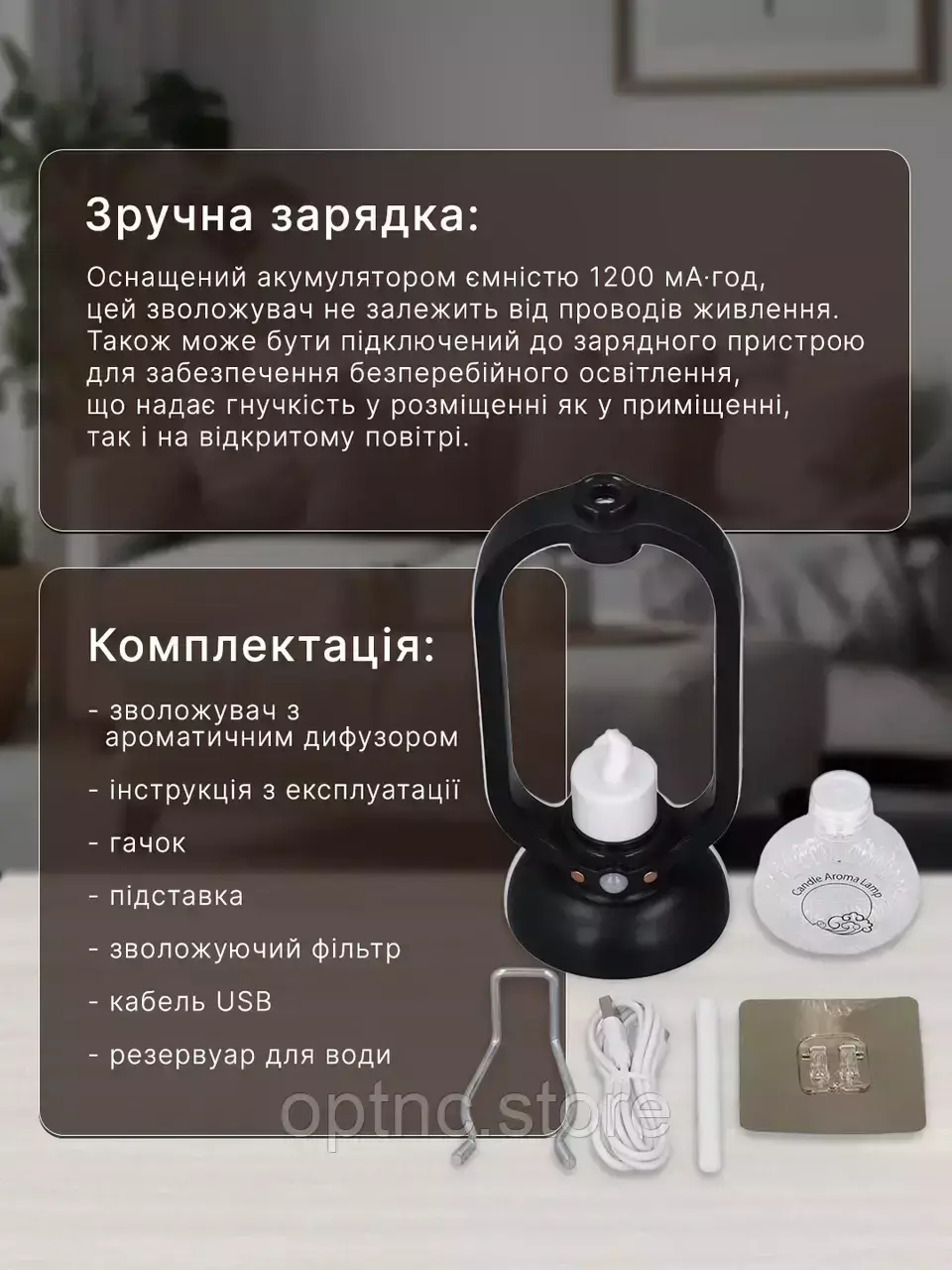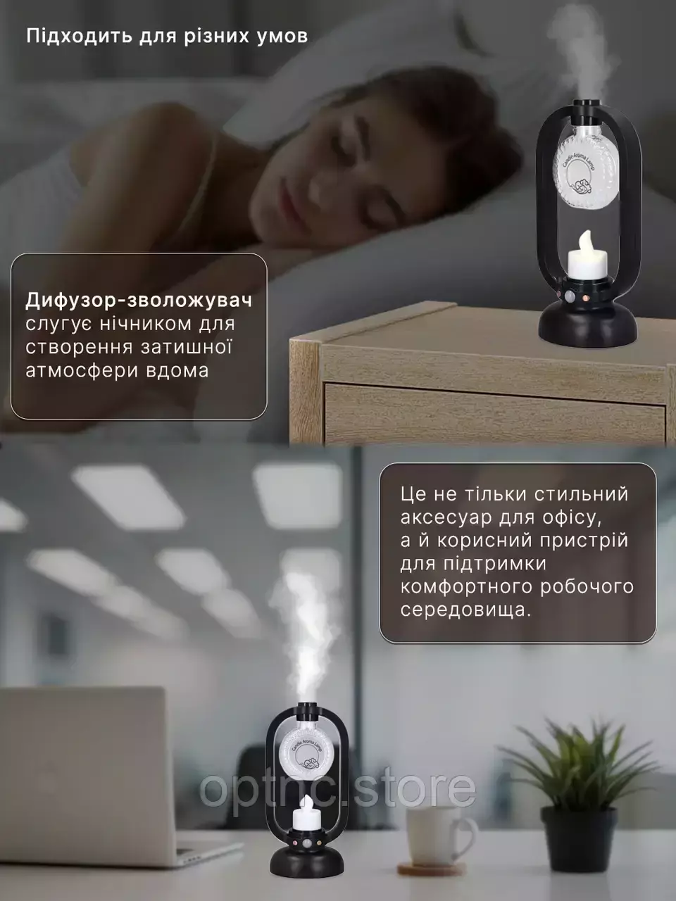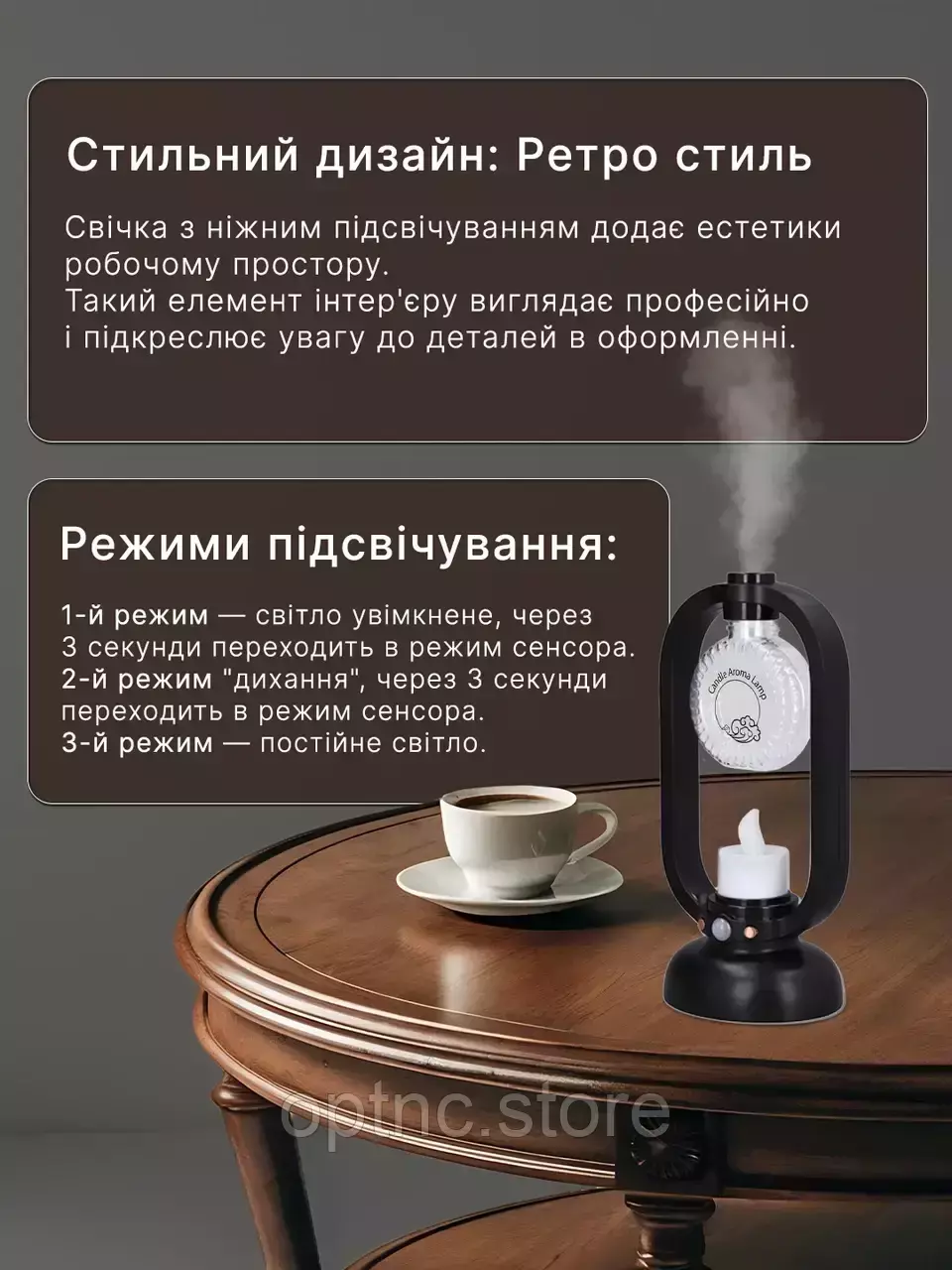 • Эстетика и стиль: аромадиффузор, стилизованный под ретро-лампу, станет элегантным акцентом вашего интерьера. Едва заметная имитация горящей свечи добавит волшебства в любое мгновение – будь то вечер с книгой или романтический ужин.