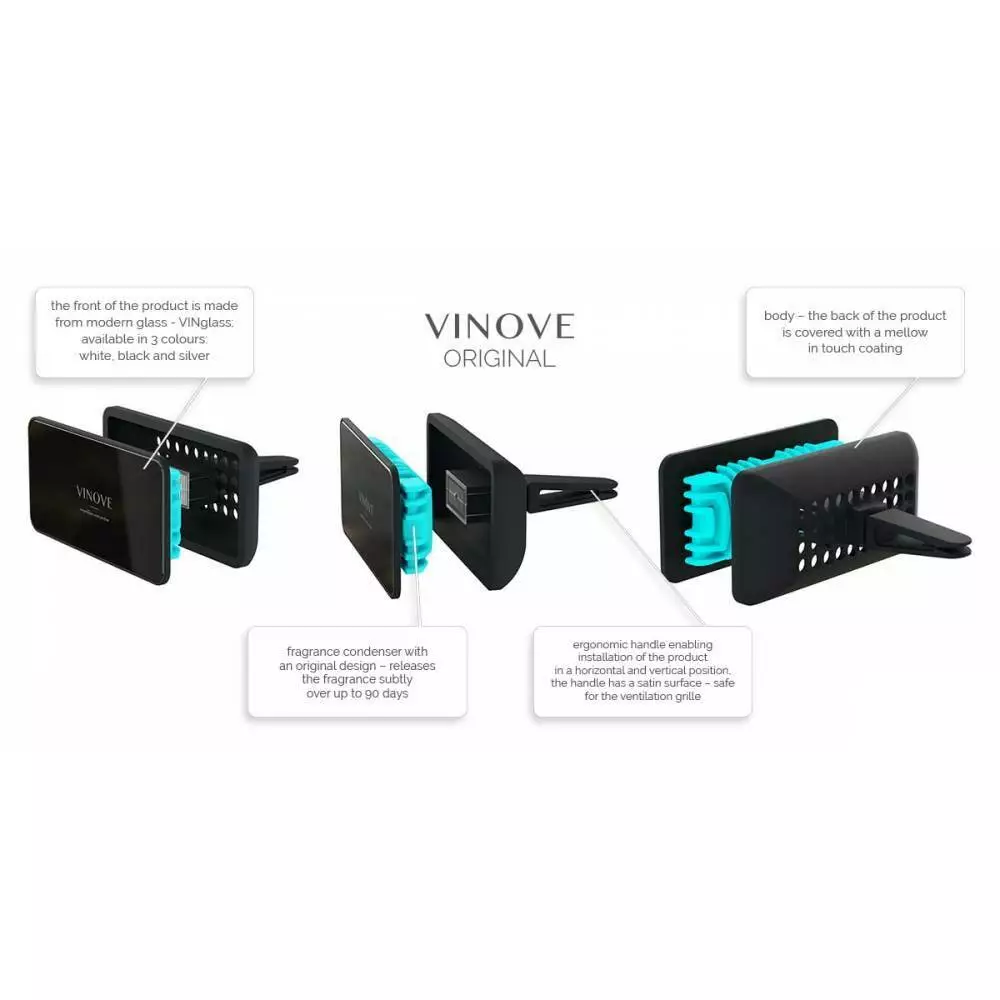 Ароматизаторы для автомобилей VINOVE источают аромат в течение не менее 90 дней. Аромат медленно выделяется благодаря концентрированным духам и технологически продвинутым полимерам, используемым в качестве ароматизатора.