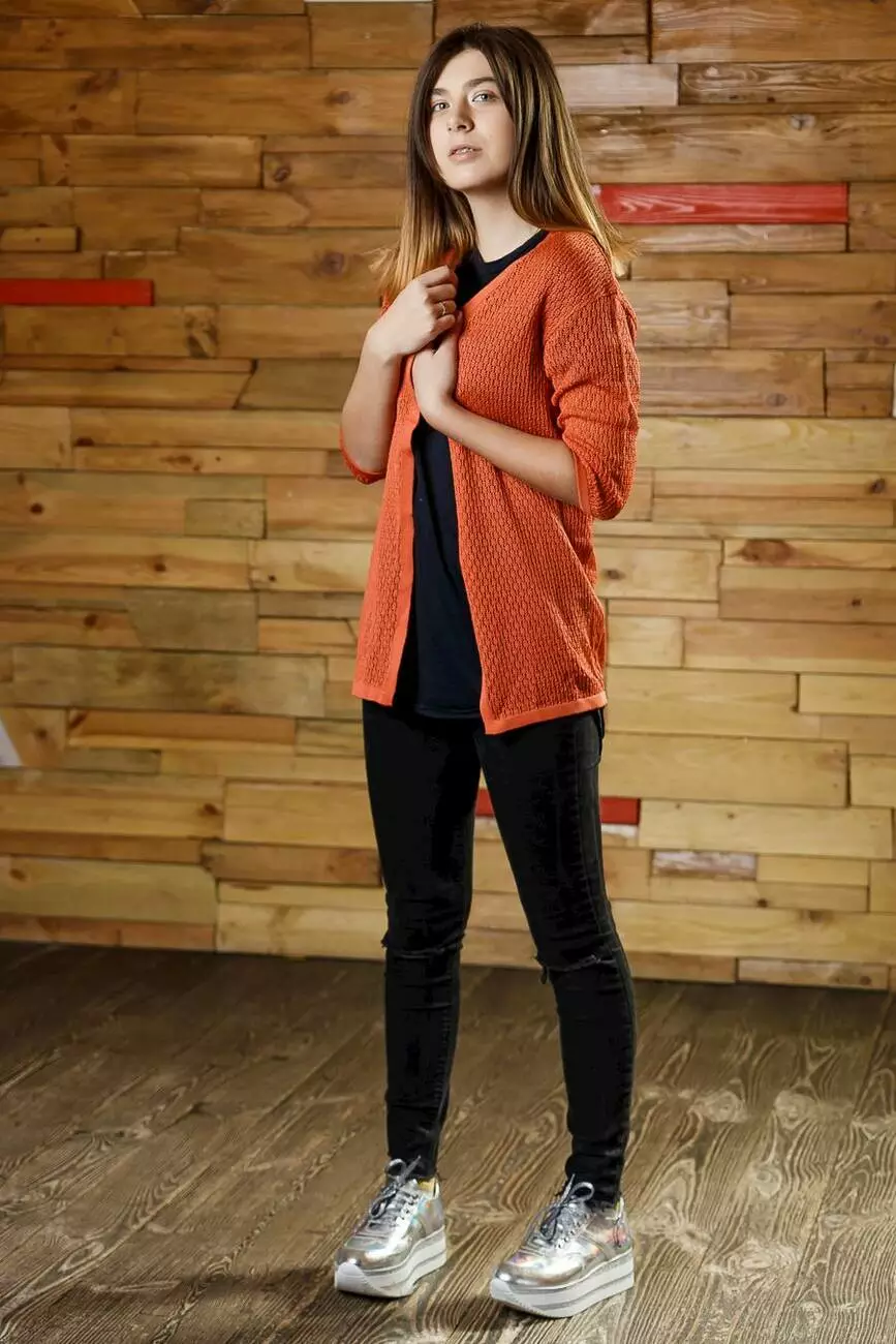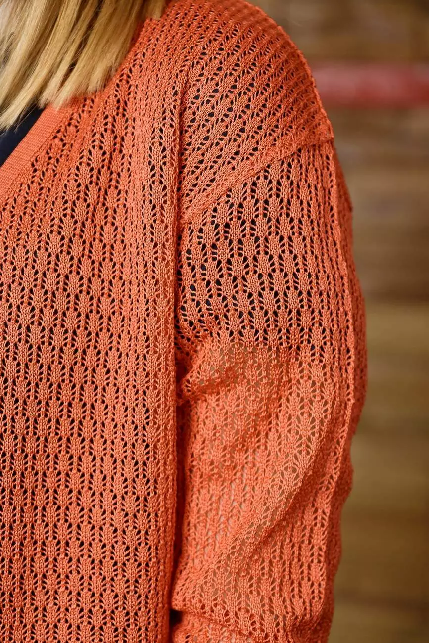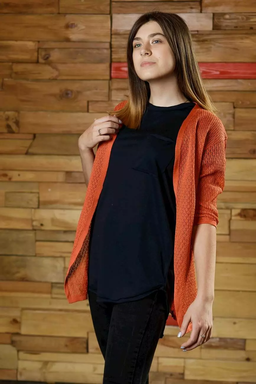 Деталі: Кардиган теракотового кольору. Вкорочені рукави. Прямий вільний крій. Ніжна ажурна текстура.
