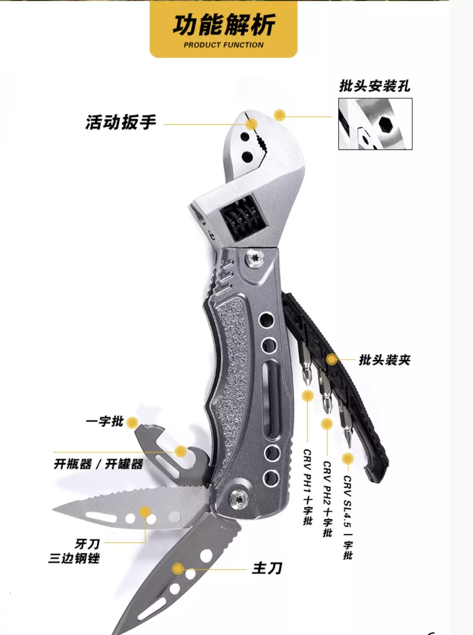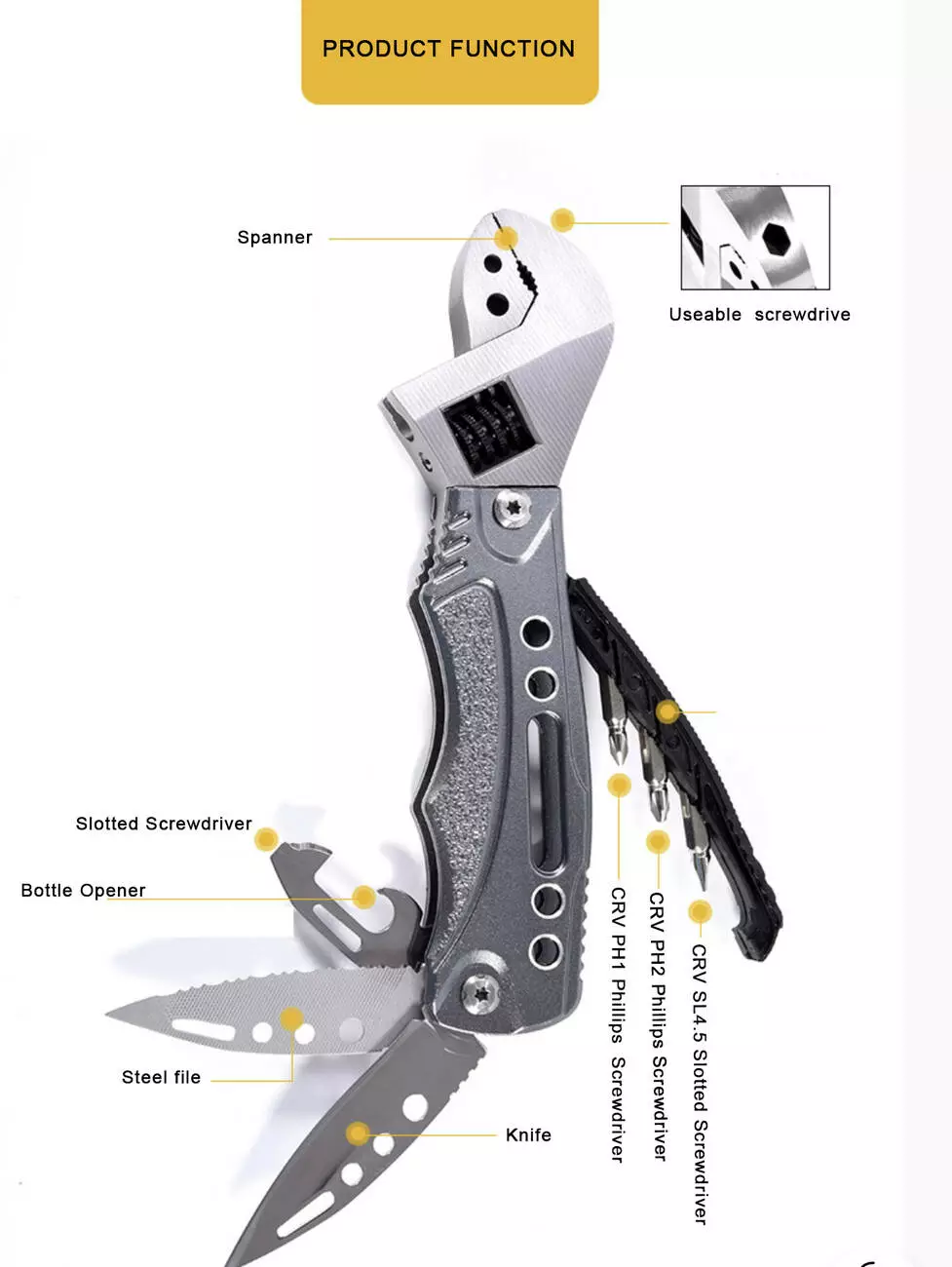 Многофункциональный инструмент Traveller Premium из нержавеющей стали: разводной ключ, отвертка со сменными насадками (3 насадки — 2 крестообразных, 1 плоская), лезвие, ножовка, консервный нож и открывалка для бутылок.