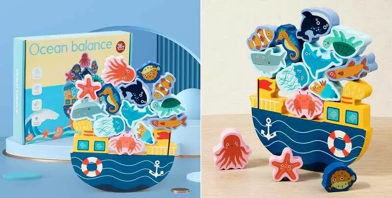 Балансир дерев’яний C 75593 (36) основа у вигляді корабля, маленькі фігурки морських тваринок, в коробці