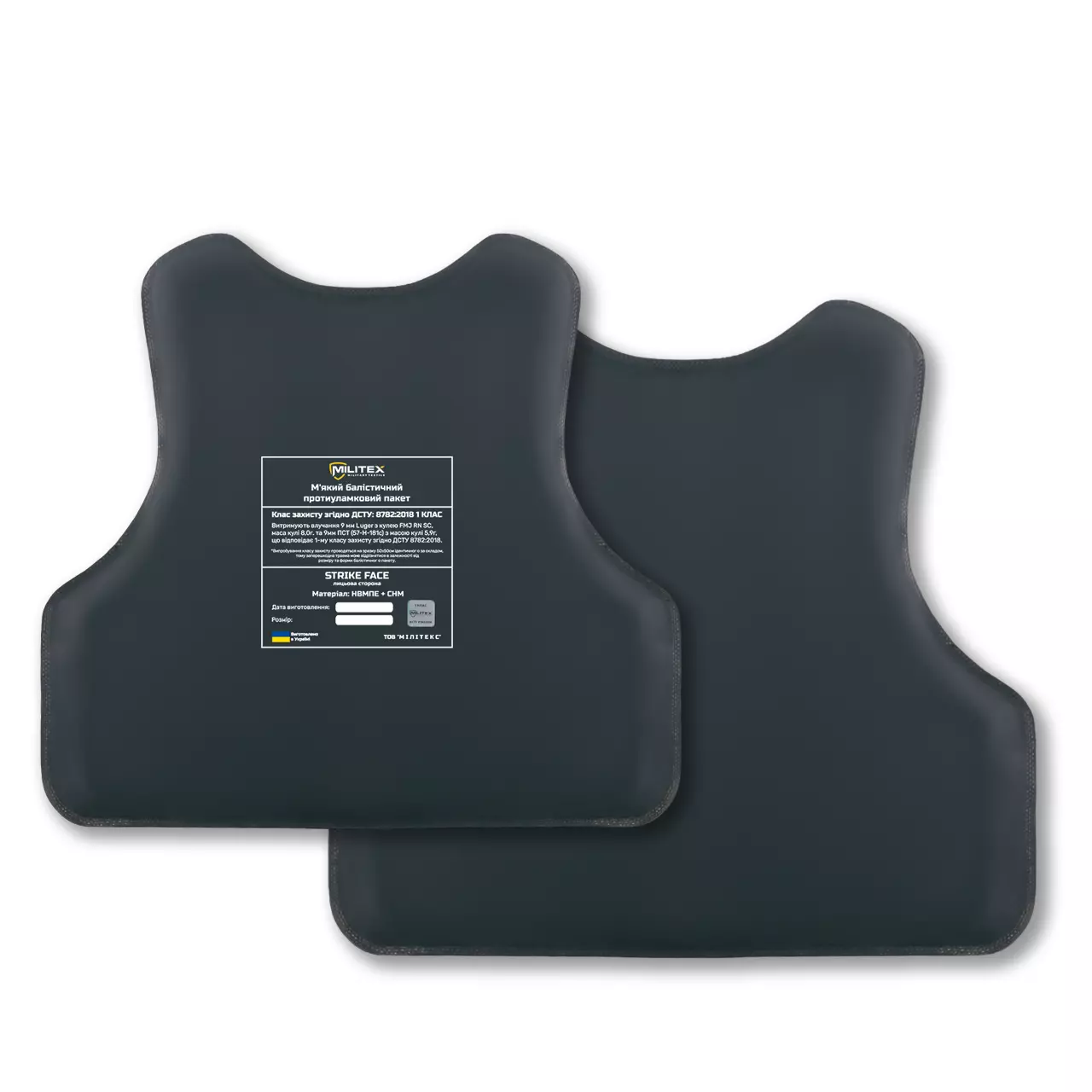 - шаром 9х19 мм Luger (скорость 401±1 м/c) в цельнометаллической оболочке из медного сплава с носовой частью полусферической формы с мягким (свинцовым) сердечником в соответствии с требованиями п. 6.1.2. (при нормальных условиях эксплуатации), п. 7.1. 1, табл. 1 ДСТУ 8782:2018 Средства индивидуальной защиты. Бронежилеты.”, относительно 1 класса защиты; максимальная глубина внепрепятственной деформации – 20,0 мм.