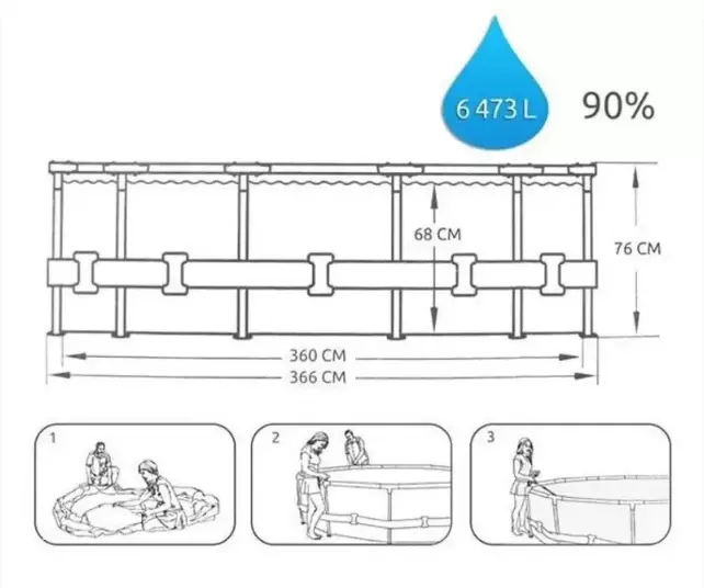 можна заповнювати до 90% об’єму. Басейн вміщує до 6473 літрів води.