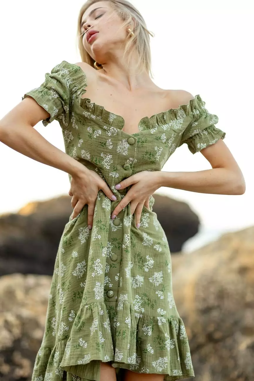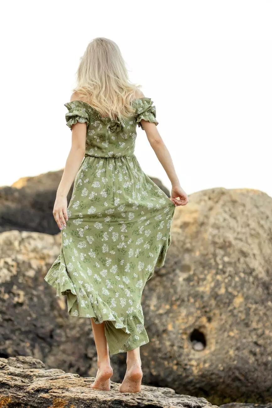 Бавовняна ніжна сукня MIRANDA з відкритими плечима з квітковим принтом колір мімоза на хакі