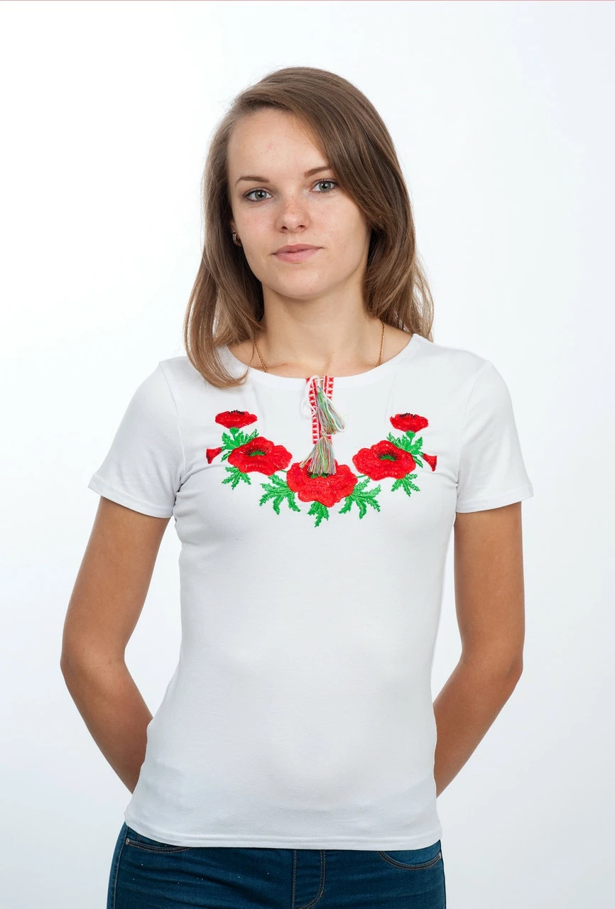 Красивая и нарядная модель футболки с вышивкой в виде красных