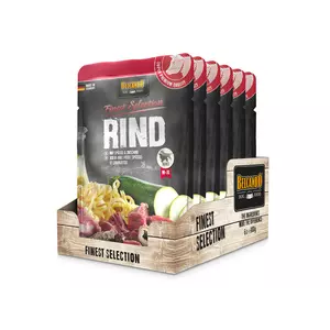 BELCANDO (Белькандо) Яловичина з локшиною та цукіні - чудовий смак в індивідуальних порціях. Соковите м'ясо приправлене добірними інгредієнтами, дбайливо готується окремими порціями. Завдяки маслу будяка холодного віджиму, рецептура п'яучої збагачена поліненасиченими жирними кислотами. Надзвичайно смачний та легкозасвоюваний корм Belcando Finest Selection відмінно підходить для чутливих та розбірливих собак.