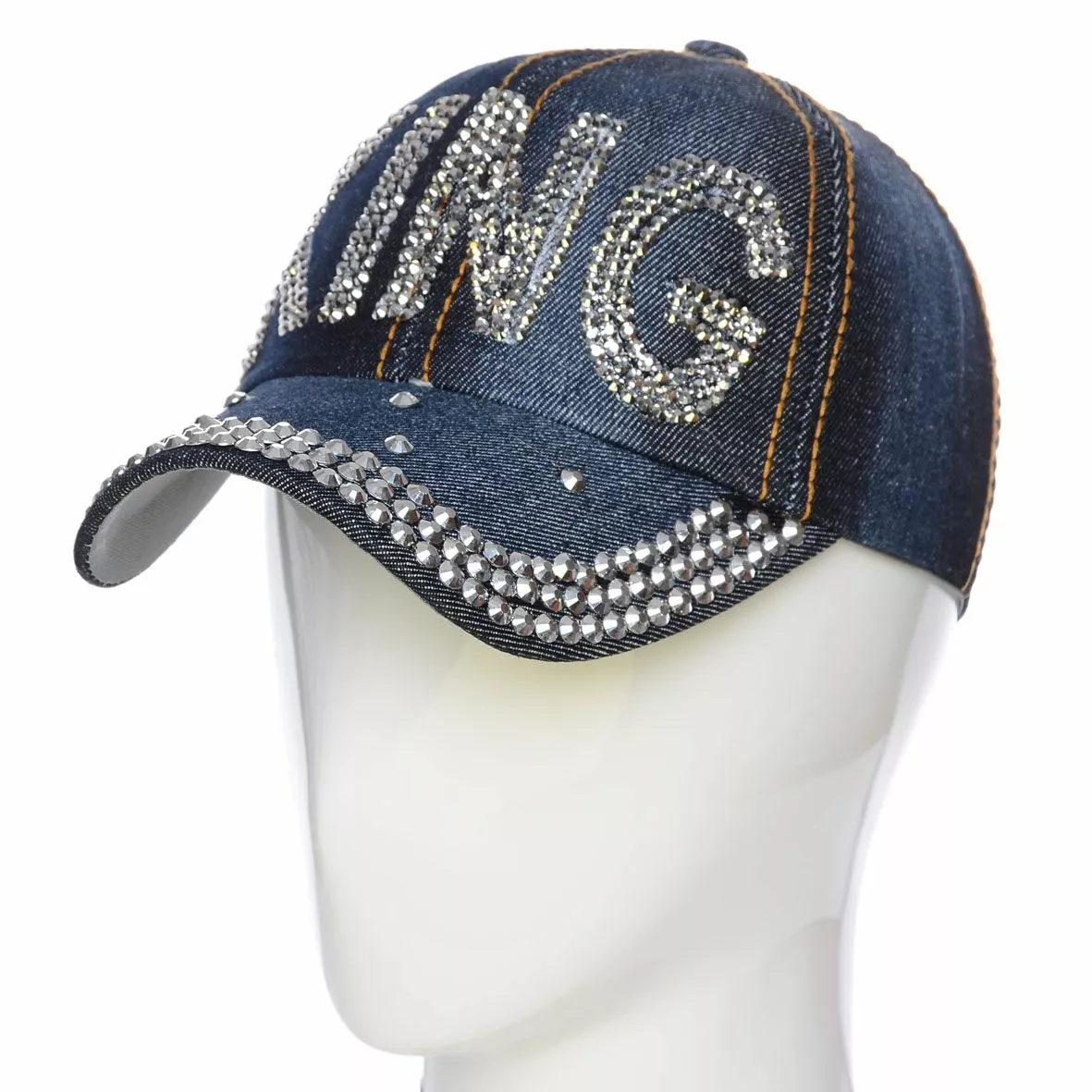 Стильная джинсовая кепка с крупными и мелкими стразами на козырьке