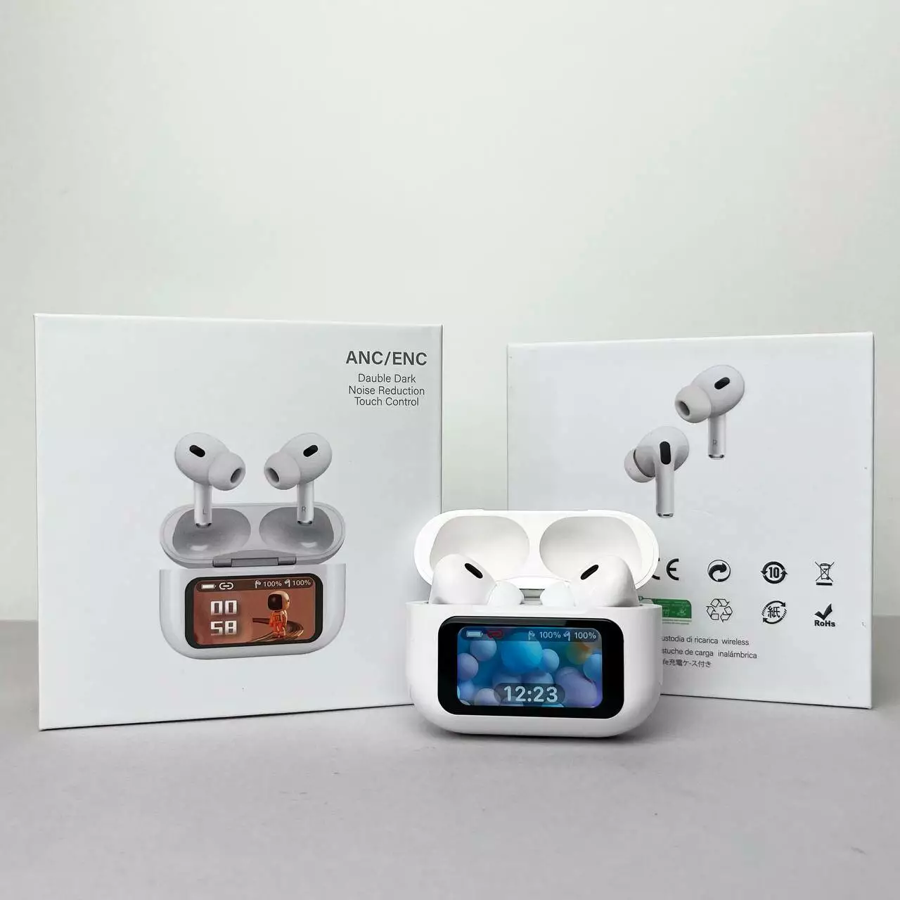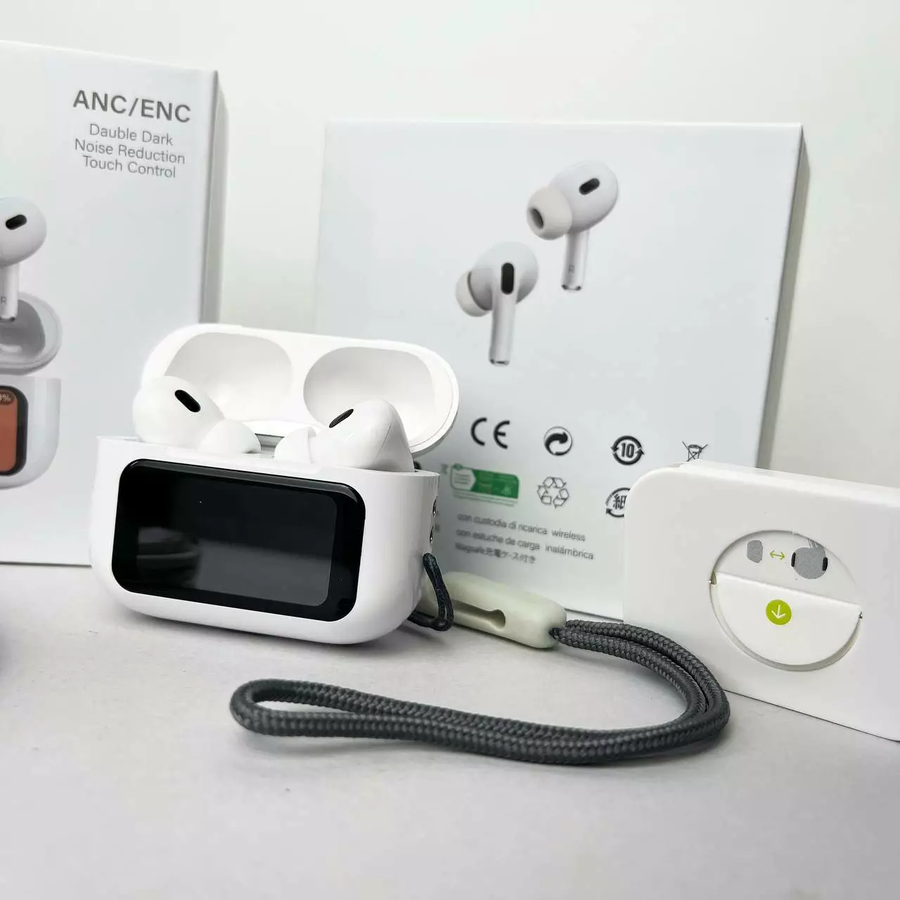 Бездротові навушники Air Pro 2 з дисплеєм - це поєднання передових технологій та інноваційного дизайну, призначене для найвимогливіших користувачів. Ці навушники дають унікальні можливості під час прослуховування музики та спілкування, завдяки інтеграції сучасних функцій, ергономічному дизайну та високій продуктивності. Керування навушниками відбувається за допомогою інтелектуального дисплея розташованого на кейсі навушників. Дисплей дає змогу користувачам обирати параметри керування шумом, «Знайти мої навушники», обирати налаштування еквалайзера та блокувати екран. Дисплей також показує користувачам рівень заряду батареї, час та тому подібне