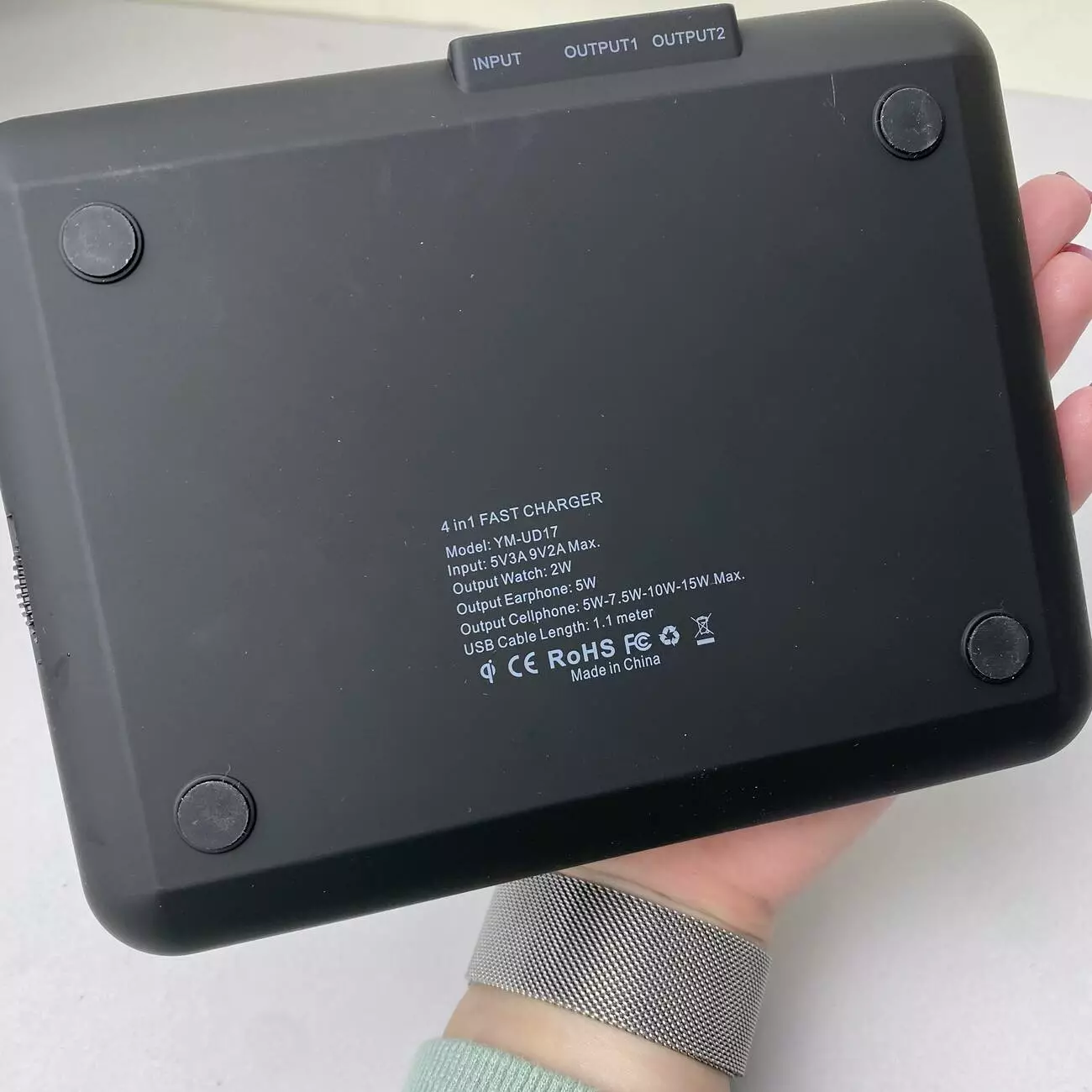 Бездротовий зарядний пристрій QI 15W UD17 (4в1) Lux - допоможе зекономити місце на вашому робочому місці або нічному столику, дозволяючи одночасно заряджати всі ваші гаджети. Замість того, щоб мати справу з безліччю кабелів і зарядних пристроїв, ви зможете підключити лише один кабель до цієї зарядної станції і з легкістю заряджати одразу 4 пристрої. Це ідеальне рішення для тих, хто цінує порядок та комфорт у повсякденному житті. Крім того, зарядка працює швидко і надійно, забезпечуючи енергією ваші гаджети в будь-який час. Завдяки компактному дизайну, зарядна станція легко впишеться в інтер'єр будь-якої кімнати або офісу, а її можливості універсальні для сучасних пристроїв.