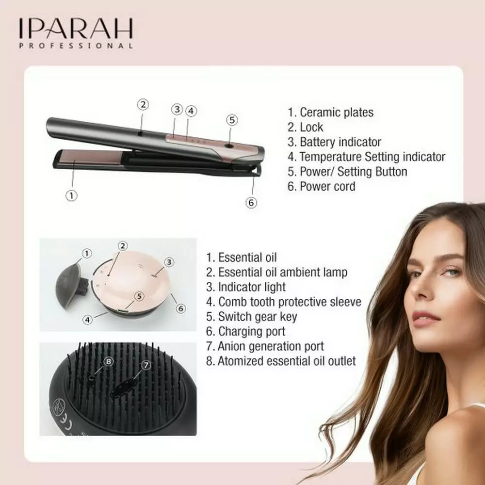 Багатофункціональний набір IPARAH P‑182 Hair Straightener Flat Iron & Essential Oil Brush Set - це комплект для комплексного догляду та укладання волосся, що включає бездротовий електричний випрямляч і аксесуари для живлення та догляду. Випрямляч оснащений ефективним нагрівальним елементом з турмаліново-керамічним покриттям нагрівальних пластин, що забезпечує швидкий і рівномірний прогрів для створення гладкого, рівного волосся. Діапазон регульованої температури дозволяє підібрати оптимальний режим для різних типів волосся, а LED індикатор відображає вибрані параметри. У комплект також входить щітка-гребінець з функцією догляду за волоссям, ємність для олії та додаткові аксесуари, що робить цей набір відмінним рішенням для комплексного догляду та укладання. Бездротове виконання забезпечує свободу руху та зручність використання як удома, так і у поїздках.
