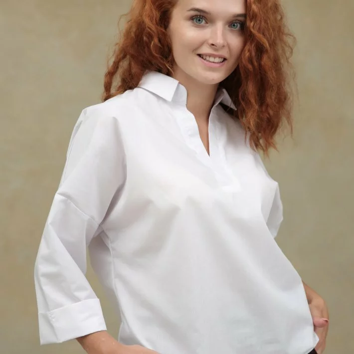 Зручна та практична блуза з рукавом 3/4. Горловина відкрита, без