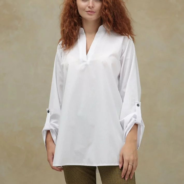 Біла блуза - туніка, трохи подовжена ззаду, з розрізами з боків.