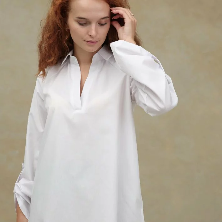 Біла блуза - туніка, трохи подовжена ззаду, з розрізами з боків.