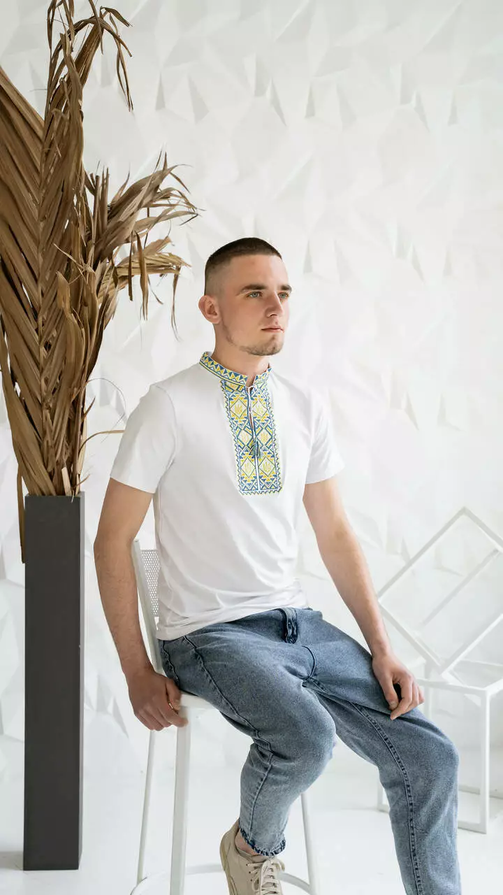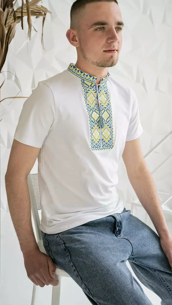 Біла патріотична вишита чоловіча футболка з "Тризубом" ЧФ-23