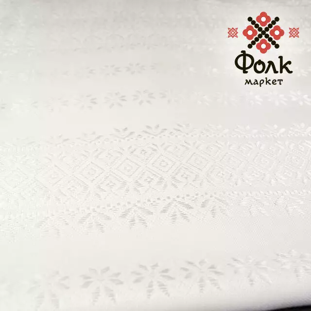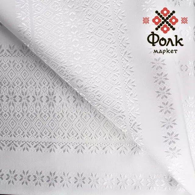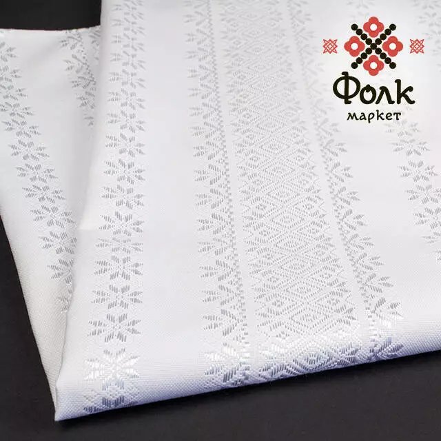 Белоснежная ткань с нежным белым орнаментом. Звездочки-алатыри отражают серебристые блики или темнеют в зависимости от освещения.