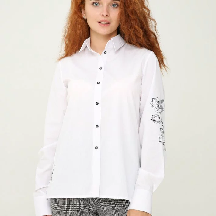 з широким манжетам і глибокими розрізами. На блузі виконана вишивка