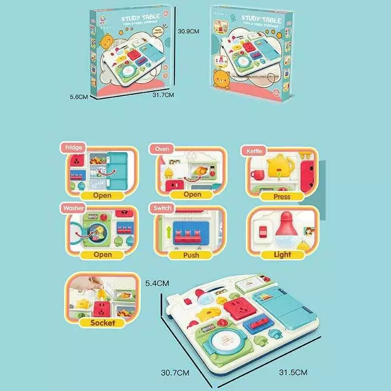 Бізіборд 25889 E (36) “Кухня”, підсвічування, звуки. фрази англійською, рухомі елементи, перемикачі, розетки, в коробці