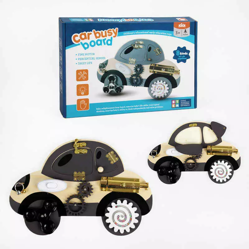 Бізіборд дерев`яний C 61674 (40) “Машина”, замочки, шестерні, пальчикові ігри, в коробці