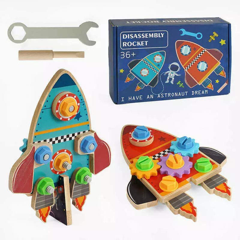 Бізіборд дерев`яний C 64001 (32) “Космічна ракета”, викрутка, гайковий ключ, шестерні, болтики, в коробці