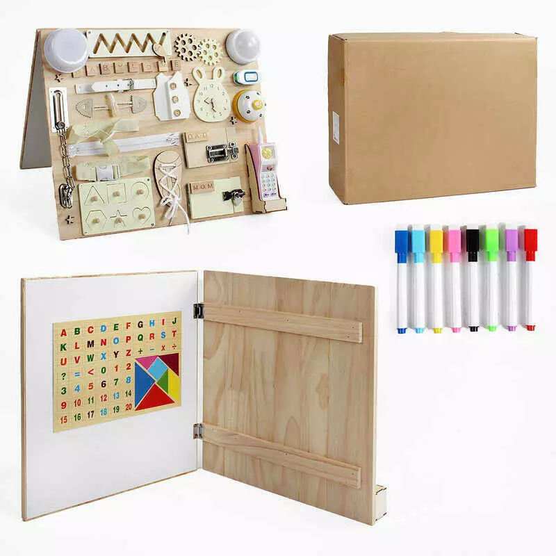 Бізіборд дерев`яний C 64844 (4) лампочка, телефон, звук, підсвіч., фрази англійською мовою, музикальний механізм, магнітна дошка, дзвінок, в коробці