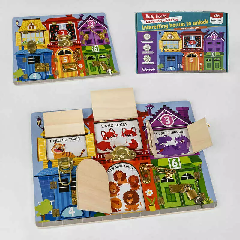 Головна > Каталог > Іграшки > Деревяні іграшки > Бізіборд дерев`яний С 49417 (20) “Квартирки з тваринами”, 6 видів замочків, що відкриваються віконця, в коробці оптом