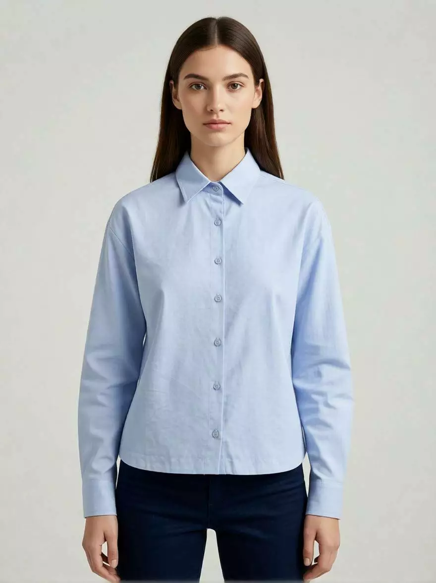 Класична жіноча сорочка в новому укороченому форматі у небесно-блакитному кольорі. Ідеальний баланс між діловою стриманістю та молодіжним трендом. Виглядає стильно та дорого завдяки натуральній фактурі тканини.