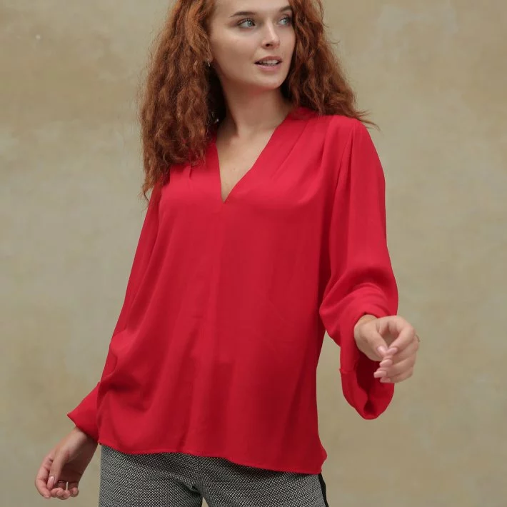 Вільний рукав 7/8 підібраний на хлястик. Блуза довга, досить
