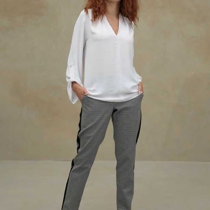 Вільний рукав 7/8 підібраний на хлястик. Блуза довга, досить