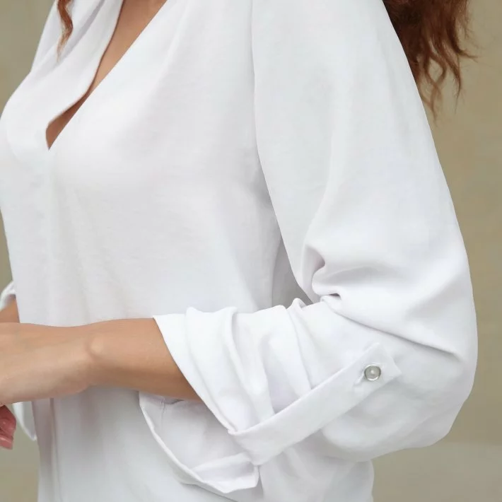 Вільний рукав 7/8 підібраний на хлястик. Блуза довга, досить