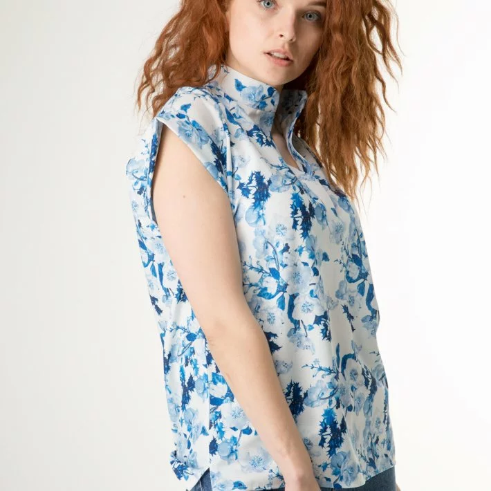 Блузка з відкритою горловиною на стійці і оригінальними манжетами