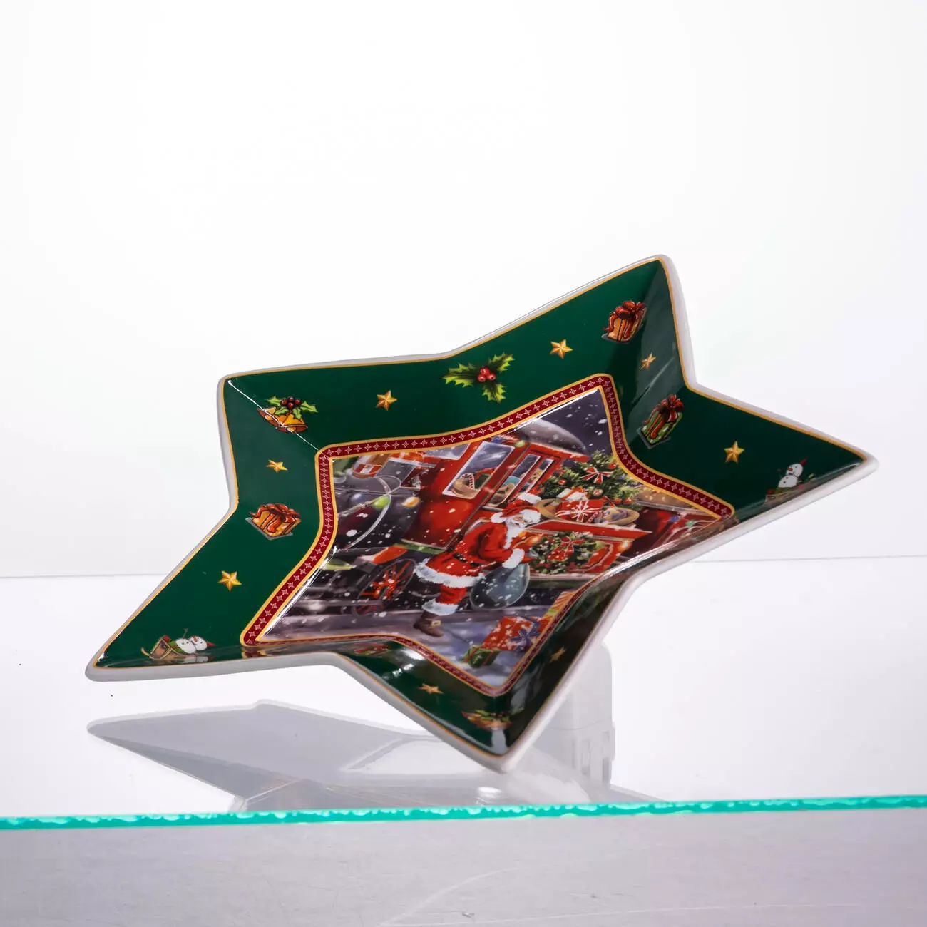 Це блюдо створене для того, щоб максимально підкреслити святкову атмосферу. Незвичайна форма п'ятикутної зірки та насичений, детально опрацьований малюнок із Санта Клаусом роблять його ідеальним центральним елементом будь-якого сервірування.