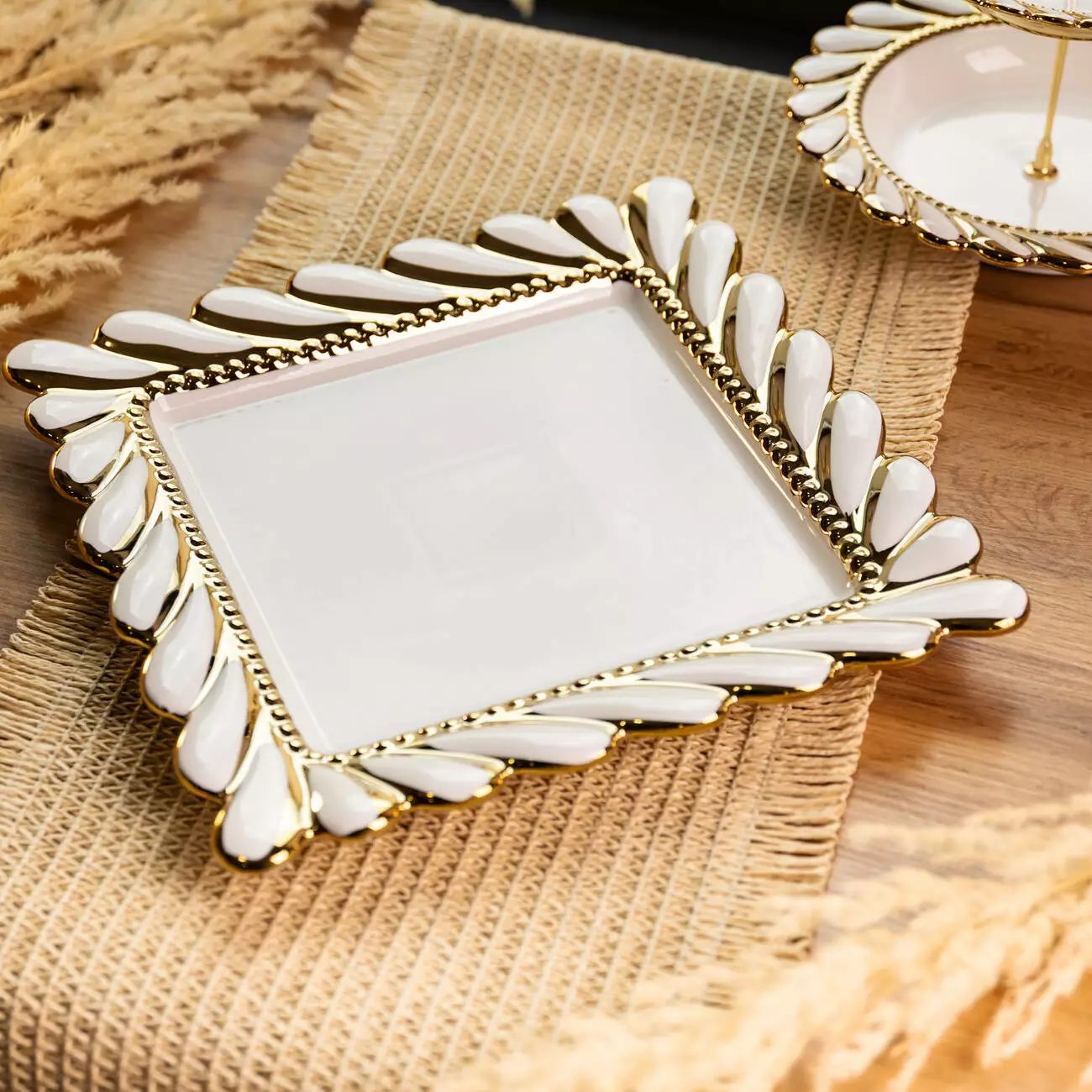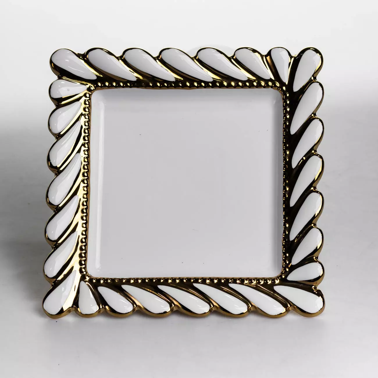 Дизайн блюда виконаний у світлому відтінку з декоративною рамкою по краю у вигляді рельєфного плетеного візерунка. Такий елемент додає виразності та чітко окреслює форму виробу, не перевантажуючи загальний вигляд. Центральна частина має гладку поверхню, що підкреслює подану страву та забезпечує зручність у використанні.