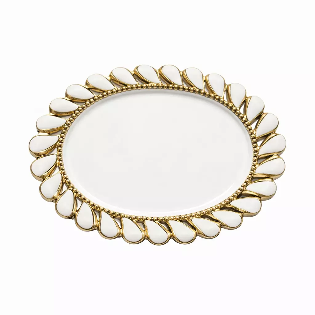 Блюдо виготовлене з порцеляни з гладкою поверхнею, що не вбирає запахи та легко очищується після використання. Край має хвилясту форму, що нагадує пелюстки, створюючи виразний контур виробу. Декоративна золота окантовка у вигляді дрібних бусин підкреслює форму та додає акуратного візуального акценту без перевантаження дизайну.