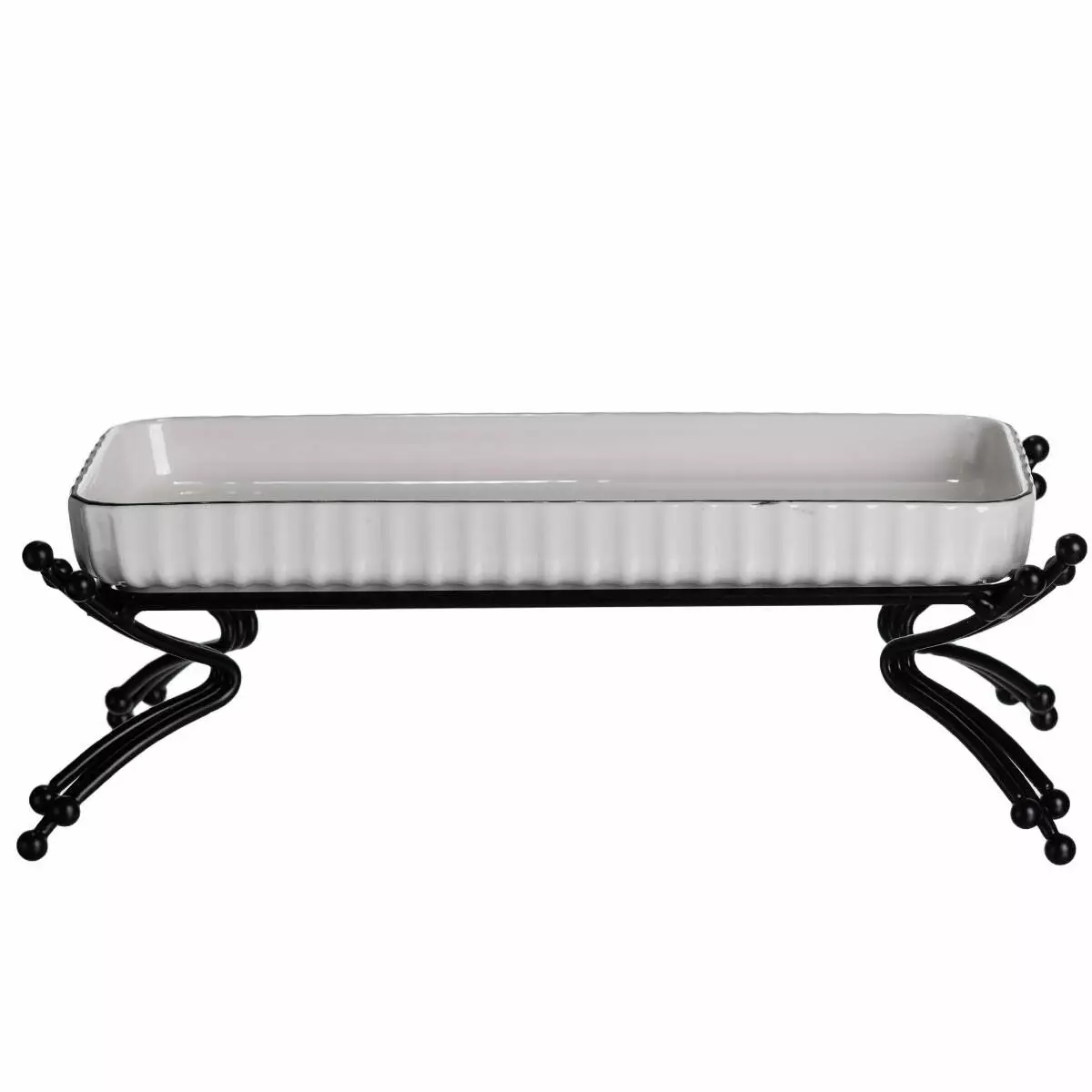 Сервірувальне блюдо на металевій підставці — це практичний елемент для подачі закусок, десертів або фруктів на святковому чи повсякденному столі. Поєднання порцелянової ємності та міцної металевої основи створює зручну конструкцію, яка підкреслює акуратність сервірування. Завдяки універсальній формі блюдо доречно виглядає в будь-якому інтер’єрі — від класичного до сучасного.