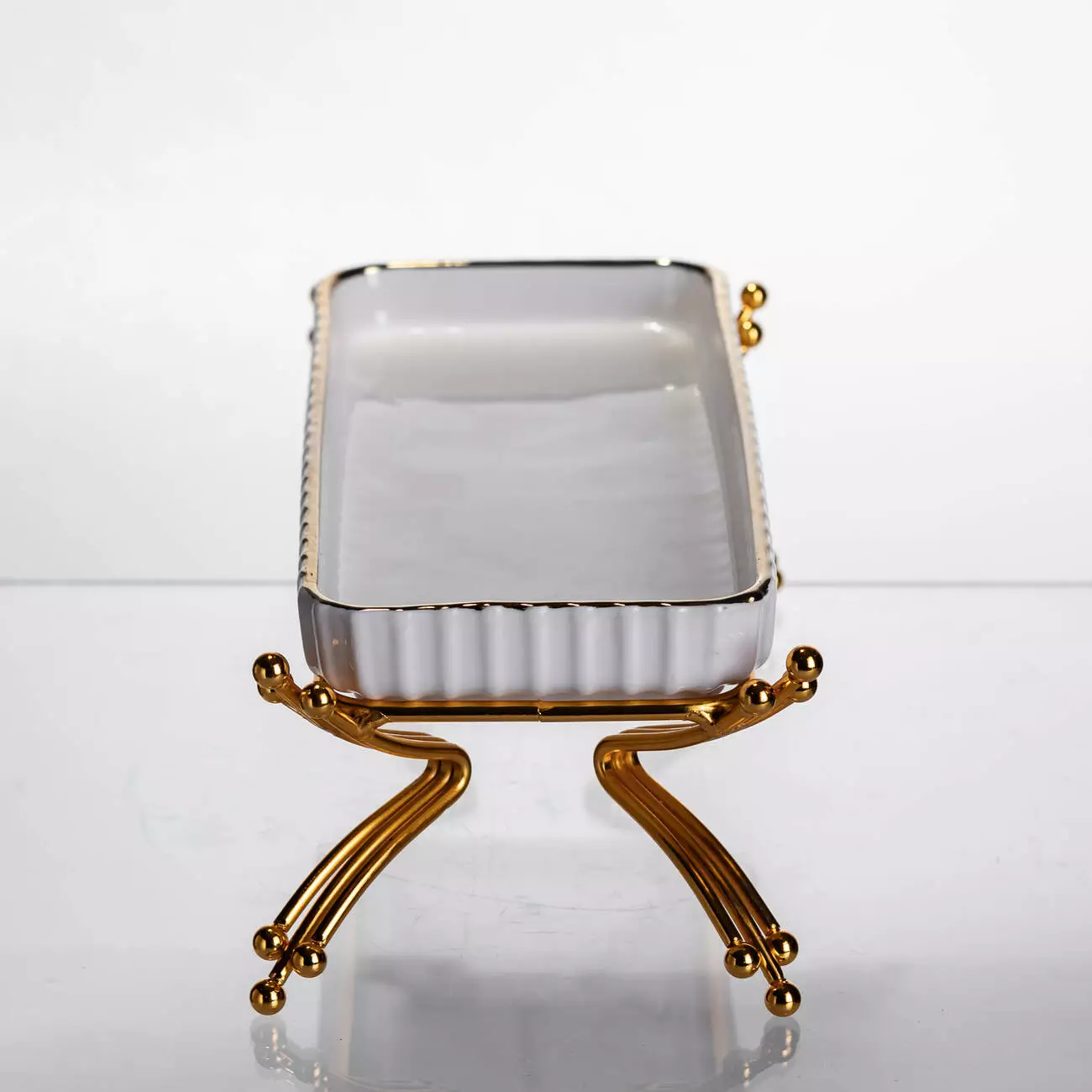 Порцелянова частина має гладку поверхню, стійку до плям і легку в догляді. Її об’єм становить 200 мл, що підходить для подачі невеликих порцій страв. Розміри блюда — 25×10.5×9 см, при цьому висота без підставки становить 2.5 см. Металева підставка забезпечує стабільність та додає виробу елегантності, роблячи подачу більш охайною та естетичною.