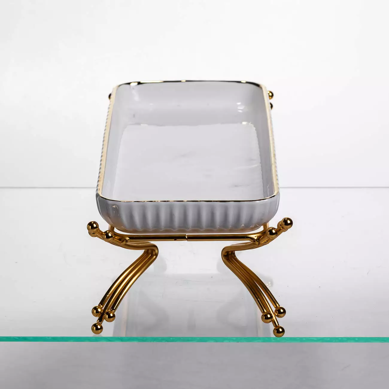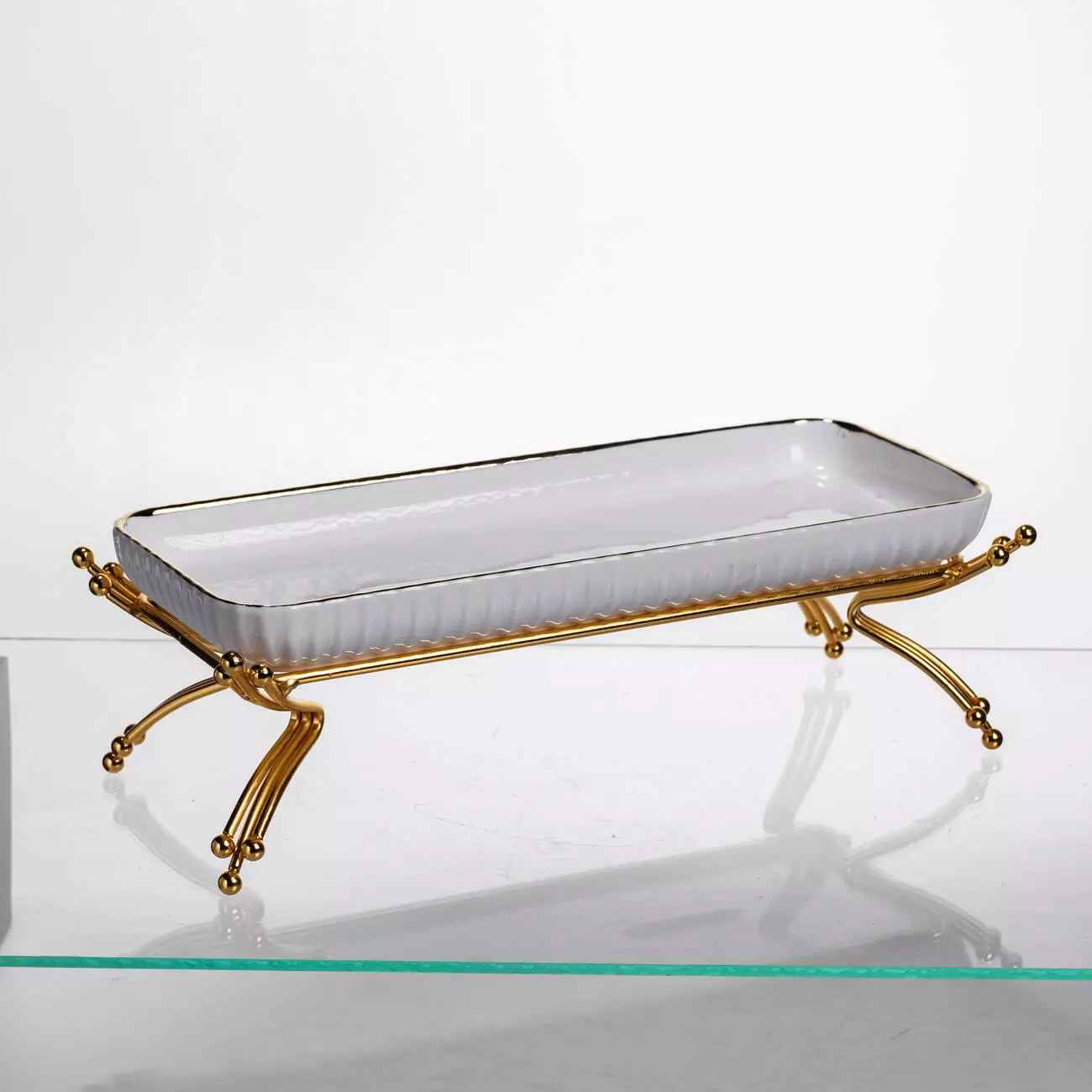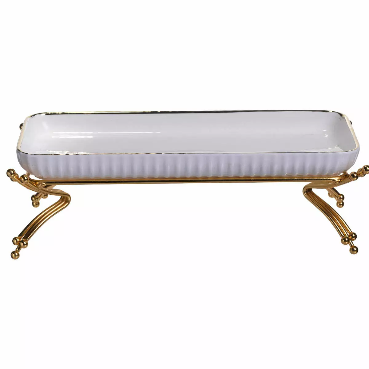 Сервірувальне блюдо на металевій підставці призначене для ефектної подачі страв, закусок чи десертів на святковому та щоденному столі. Поєднання порцелянової форми та металевої підставки створює гармонійний вигляд, що додає сервіруванню охайності та впорядкованості. Завдяки продуманій формі блюдо зручно розміщувати на столі або фуршетній зоні.