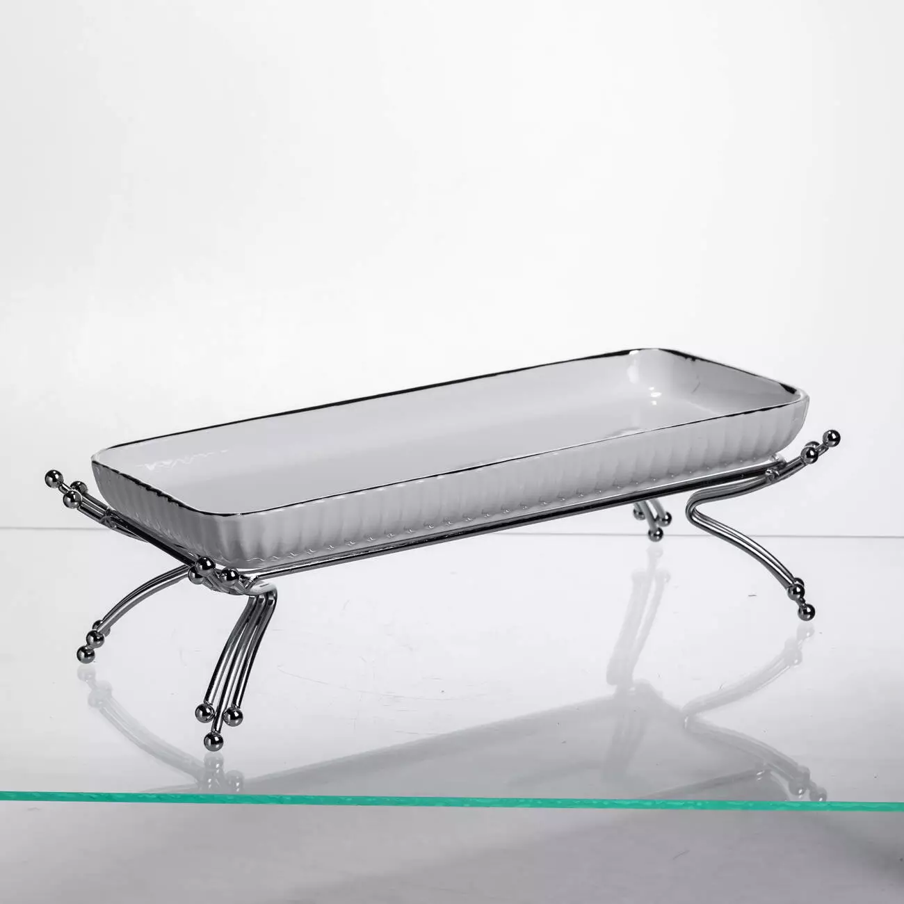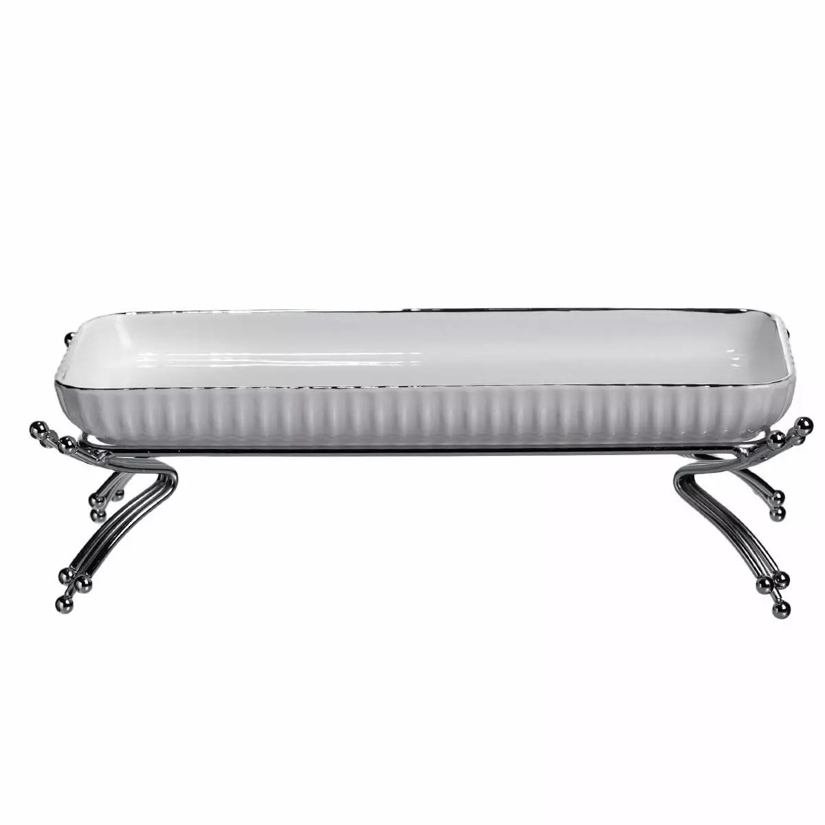 Сервірувальне блюдо на металевій підставці призначене для ефектної подачі страв, закусок чи десертів на святковому та щоденному столі. Поєднання порцелянової форми та металевої підставки створює гармонійний вигляд, що додає сервіруванню охайності та впорядкованості. Завдяки продуманій формі блюдо зручно розміщувати на столі або фуршетній зоні.