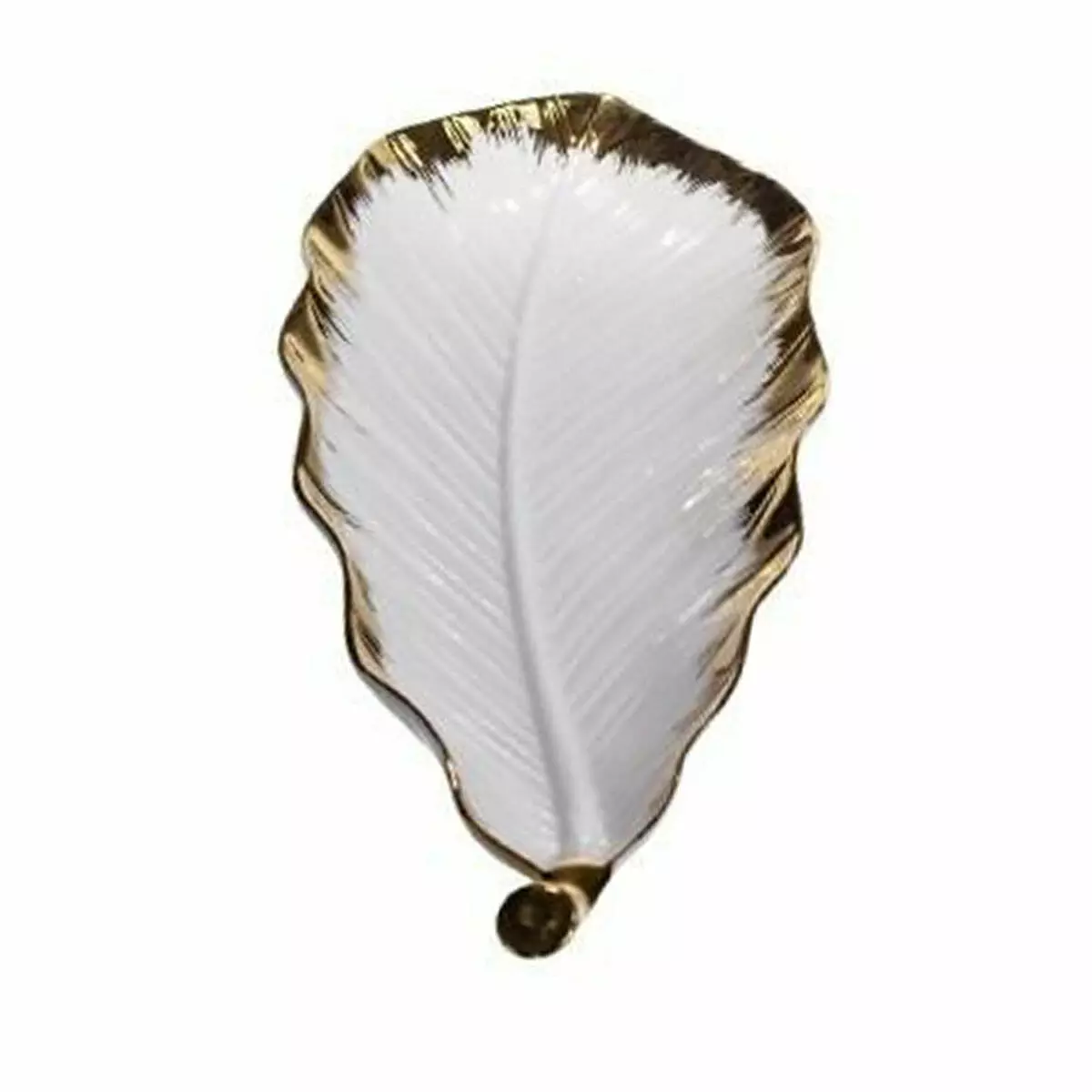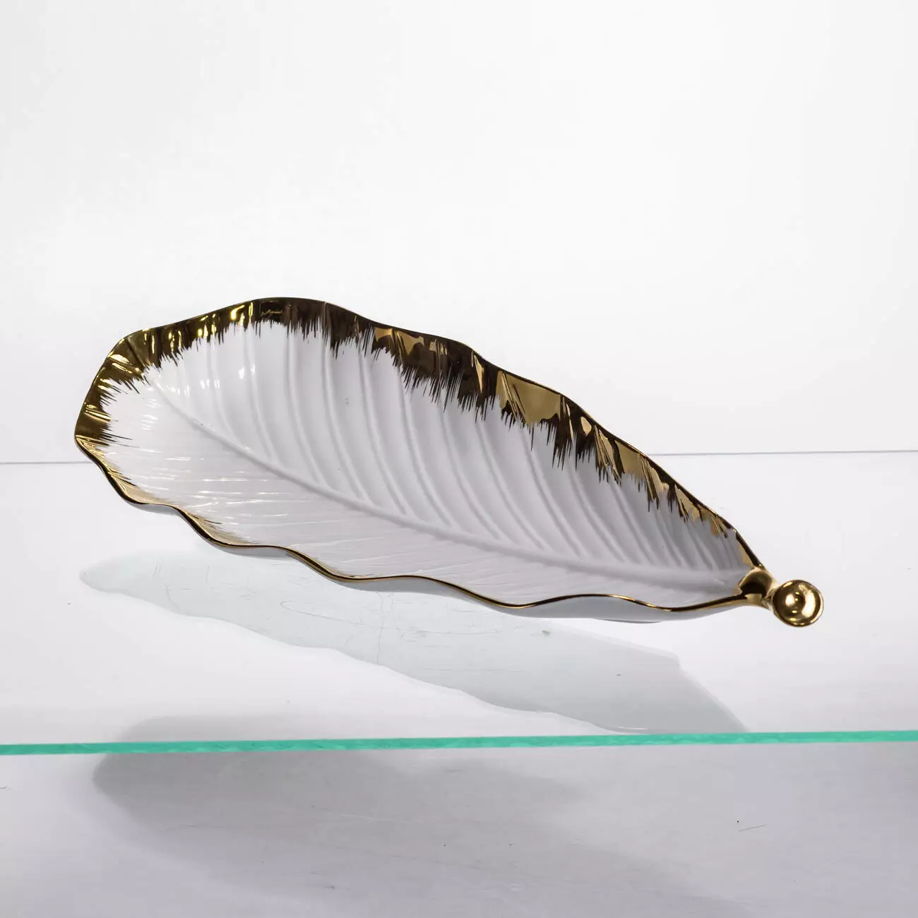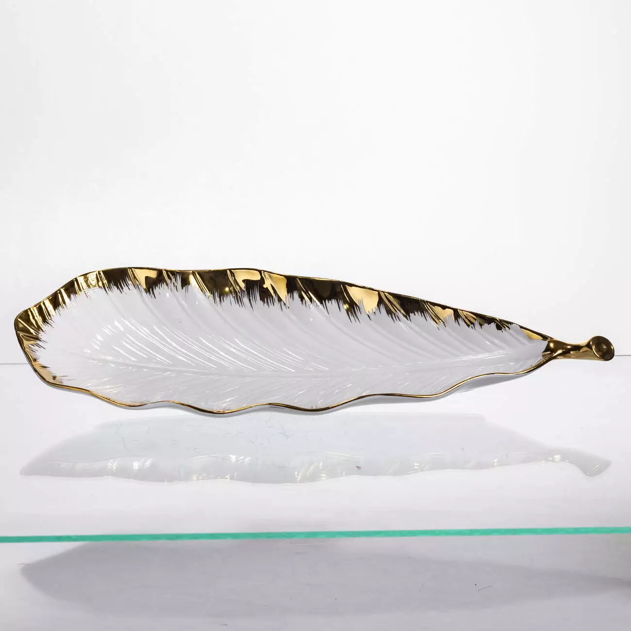 Біле покриття з глянцевим ефектом поєднується з золотистими акцентами по краях, що додає виробу завершеного вигляду. Рельєфна форма у вигляді листка з чітко вираженими прожилками виконує як естетичну, так і практичну функцію. Порцеляна легко миється та не вбирає запахів, що робить блюдо зручним у щоденному використанні.