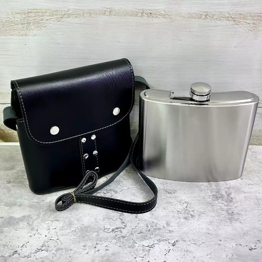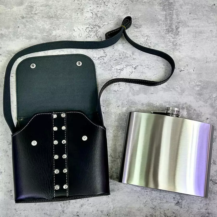 Большая фляга объёмом 32 oz (≈950 мл) из нержавеющей стали в комплекте с прочным кожаным чехлом через плечо. Увеличенный объём позволяет взять с собой достаточный запас напитков, а удобный чехол с ремнём обеспечивает комфортное ношение и защищает флягу от повреждений.