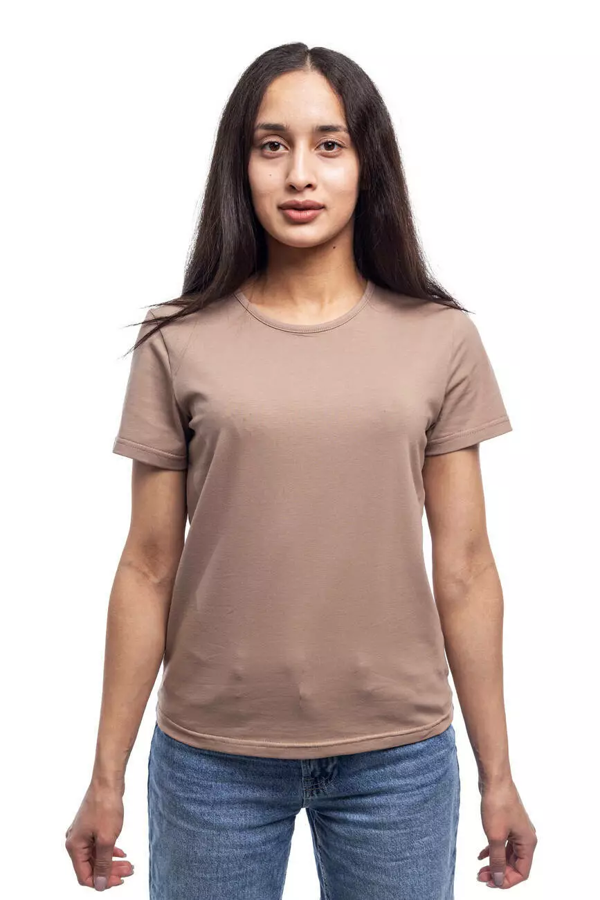 Базова жіноча футболка прямого крою — це універсальне рішення для вашого гардеробу. Модель виконана з натуральної бавовни та еластану. Завдяки своїй щільності, тканина добре тримає форму, водночас забезпечуючи дихання шкірі. Невеликий вміст еластану (5%) додає еластичності та підвищує зносостійкість виробу. Мінімалістичний дизайн із круглою горловиною пасує до будь-якого образу. Дана модель підходить для нанесення принта.