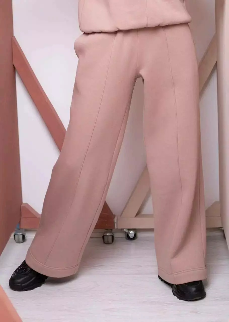 Штани широкого крою від стегон, з двома кишенями у швах та декоративною відстрочкою-стрілкою спереду і ззаду. Пояс на еластичній трикотажній резинці. Виготовлені з щільного футера з махристою внутрішньою стороною. Ідеально підходять для міжсезоння.