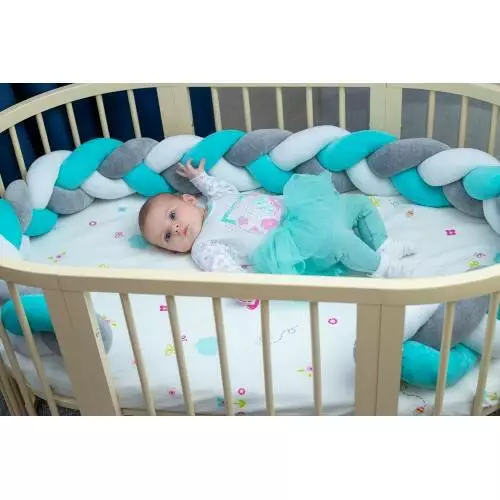 Фотография 2 товарной позиции интернет-магазина детских игрушек www.smarttoys.com.ua Бортик в кроватку Хатка Косичка Белый-Серый-Мятный 360 см (по всему периметру кроватки)