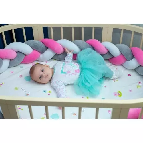 Фотография 1 товарной позиции интернет-магазина детских игрушек www.smarttoys.com.ua Бортик в кроватку Хатка Косичка Белый-Серый-Розовый 360 см (по всему периметру кроватки)