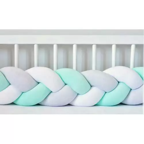 Бортик в кроватку Хатка Косичка Мятный-Белый-Пепельный 360 см (по всему периметру кроватки)