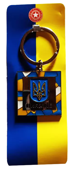 • Металлический брелок с квадратным подвесом, на котором изображён герб Украины (Тризуб) в центре мозаичного дизайна в национальных цветах.
