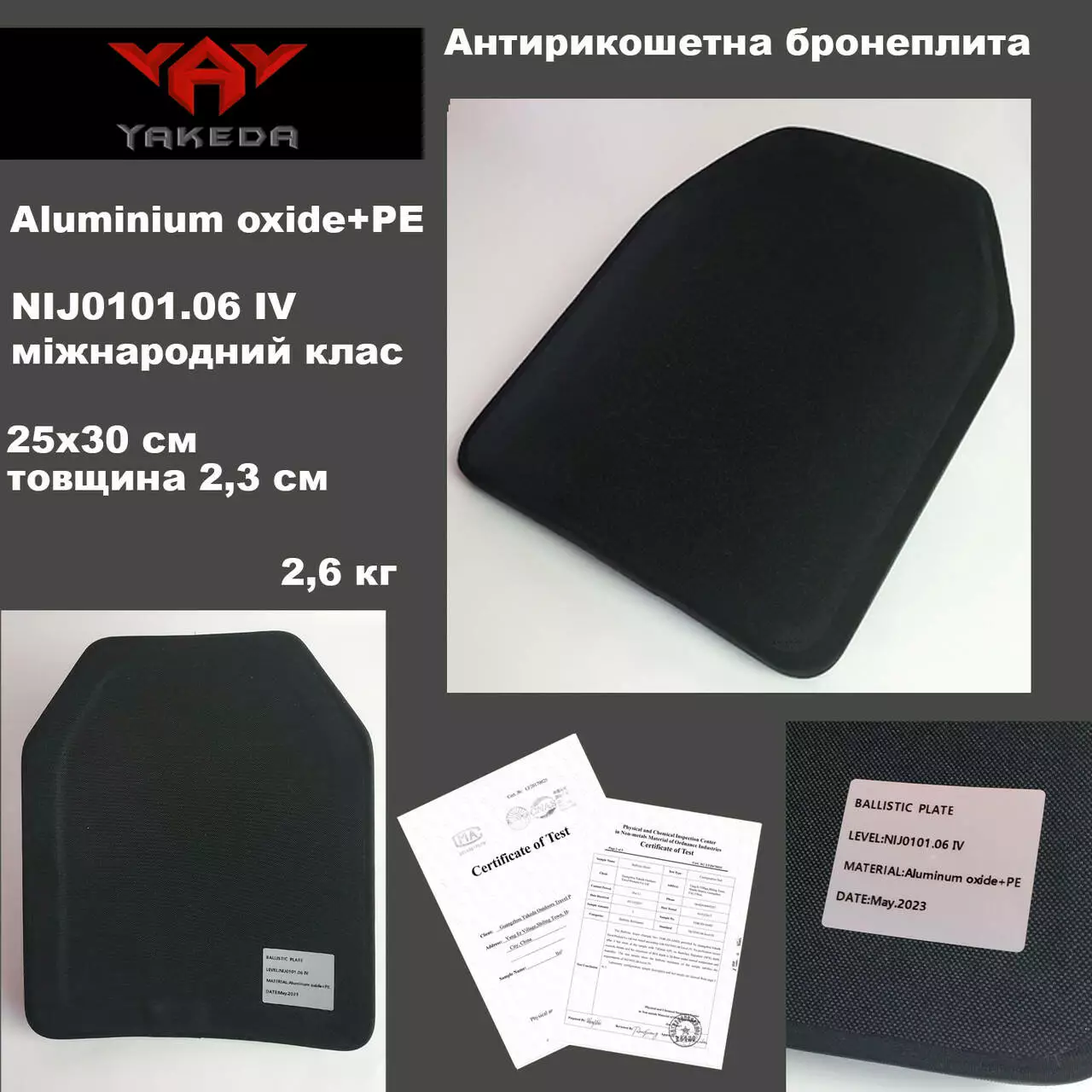 Бронеплита керамічна сертифікована YAKEDA NIJ0101.06 IV міжнародний клас Aluminium oxide+PE