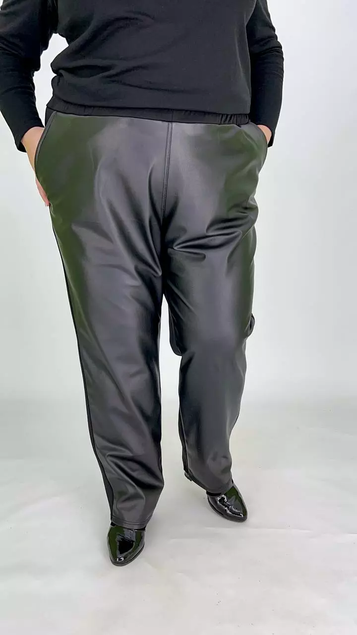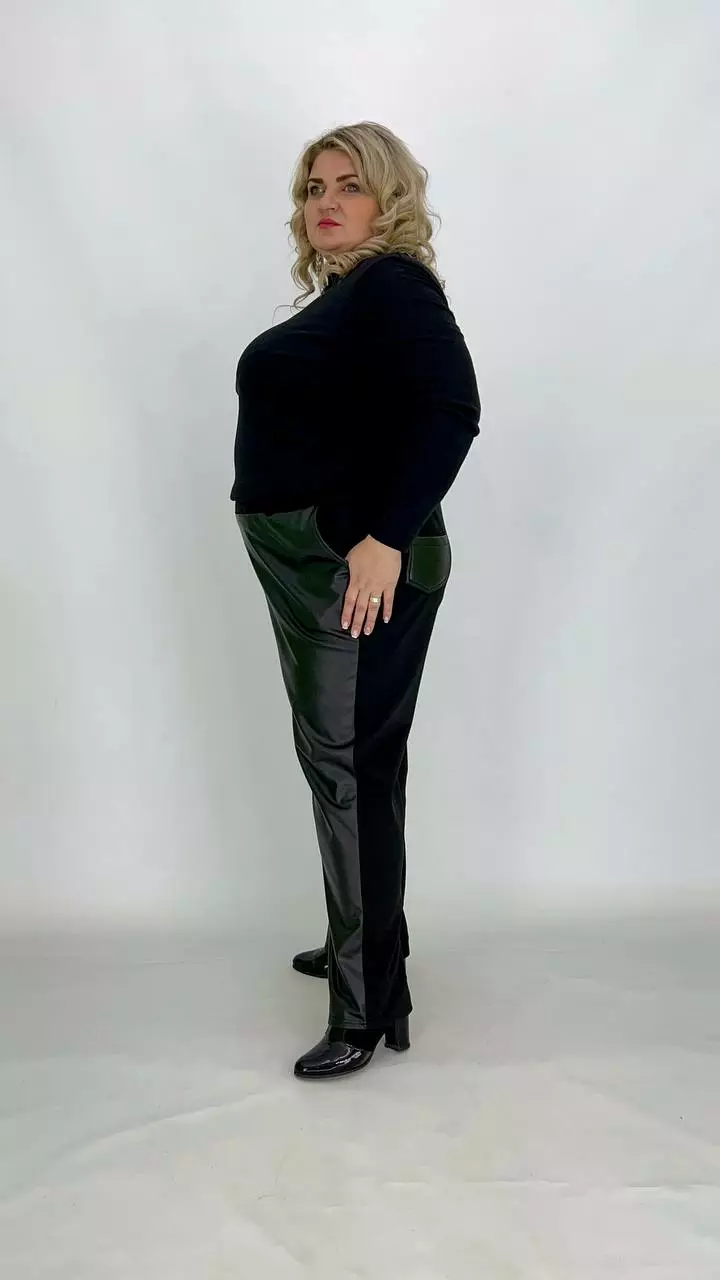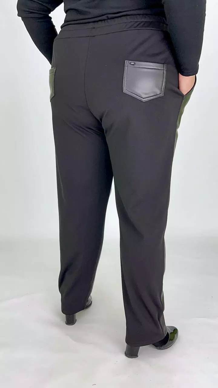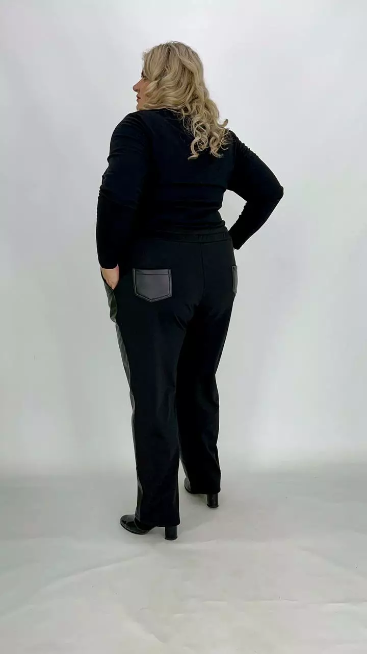 тканина мікродайвінг на флісі + екошкіра на велюрі (100% поліестер) . Штани комбіновані мікродайвінгом на флісі та екошкірою на велюрі. Дуже хороша розтяжимість, висока посадка, пояс на резинці з кишенями.