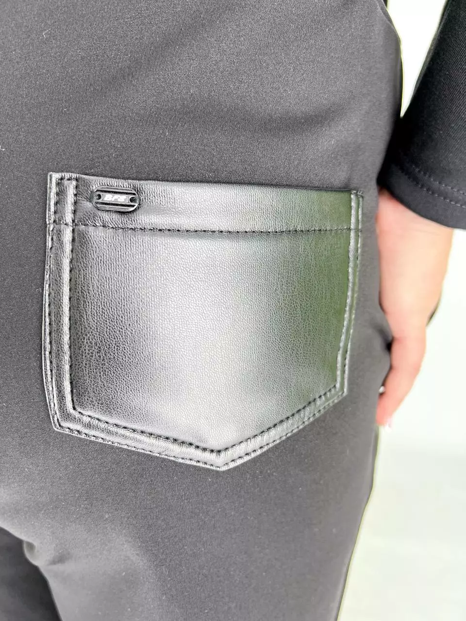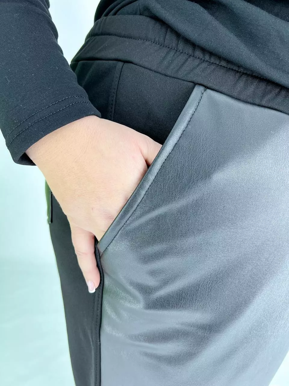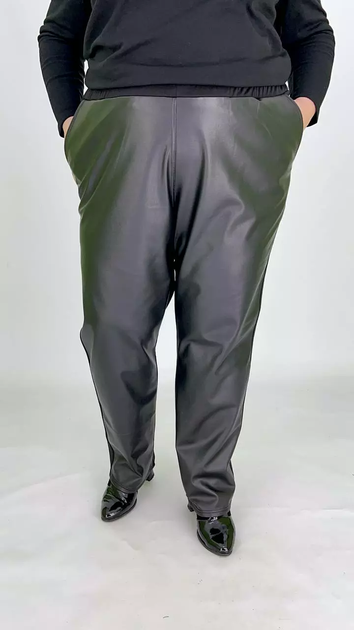 тканина мікродайвінг на флісі + екошкіра на велюрі (100% поліестер) . Штани комбіновані мікродайвінгом на флісі та екошкірою на велюрі. Дуже хороша розтяжимість, висока посадка, пояс на резинці з кишенями.