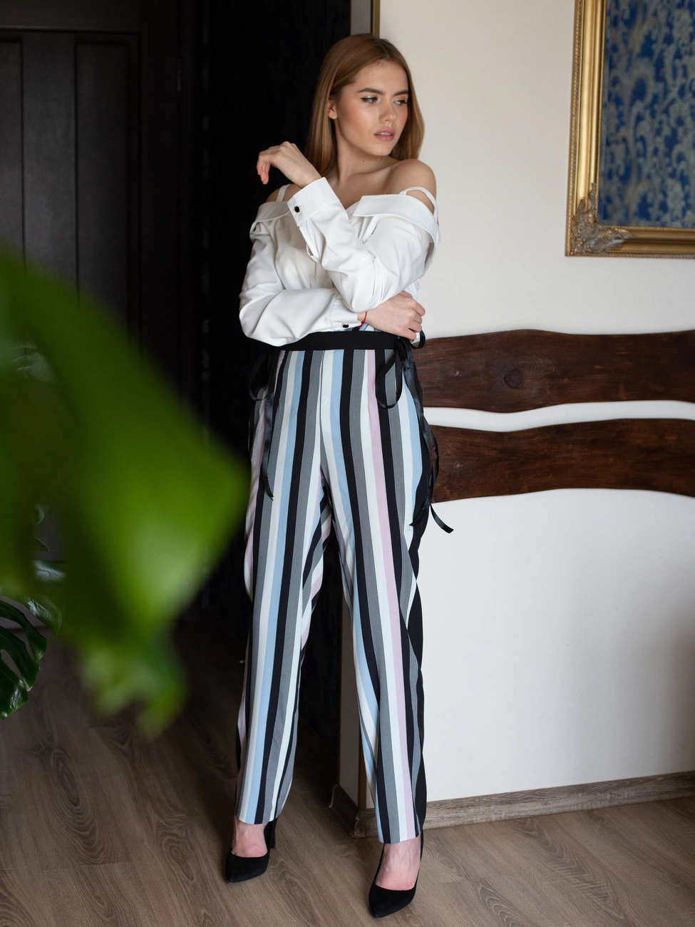 Брюки Бловди выполнены из ткани софт высокого качества. Брюки с высокой посадкой, застегиваются на потайную молнию, по бокам зав'язки. Модель гармонирует  с туфлями и на каблуке, и на низком ходу.