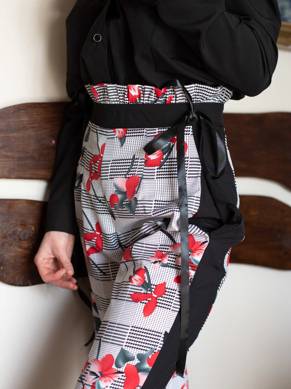 Брюки Бловди выполнены из ткани софт высокого качества. Брюки с высокой посадкой, застегиваются на потайную молнию, по бокам зав'язки. Модель гармонирует с туфлями и на каблуке, и на низком ходу.
